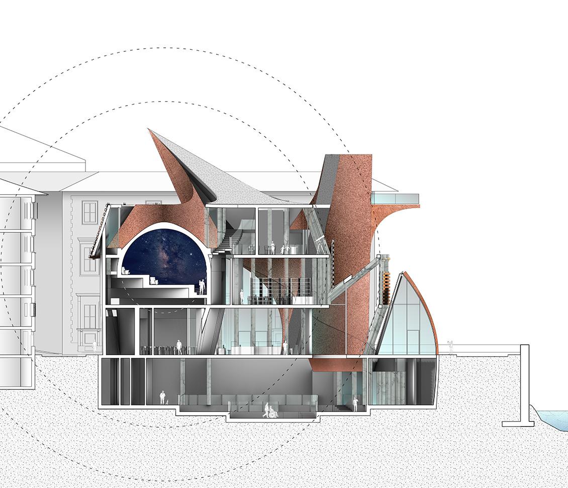 The final design of the museum’s extension creates a carefully orchestrated experience centered around its main attraction—the planetarium. Approaching the building, visitors are welcomed by two sweeping, curved corridors supported by triangular frames, which converge toward the entrance in a gesture that feels both monumental and inviting. Once inside, visitors are guided downward into a subgrade gallery space, where curated exhibitions immerse them in the broader narrative of science and exploration. As they ascend through the building, the journey unfolds gradually, revealing a layered sequence of programs: additional exhibition halls, state-of-the-art preservation and restoration laboratories, and a series of observation decks that connect the interior experience with the surrounding landscape. Rising at the heart of it all, the planetarium becomes both a physical and symbolic destination, drawing visitors upward and inward.