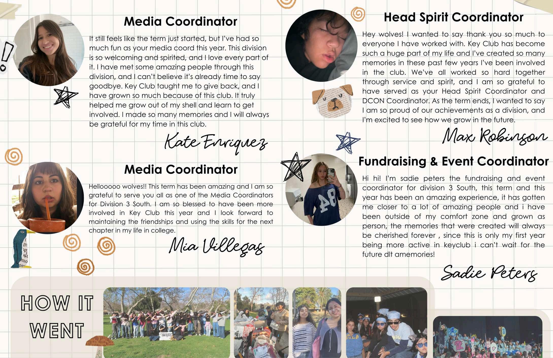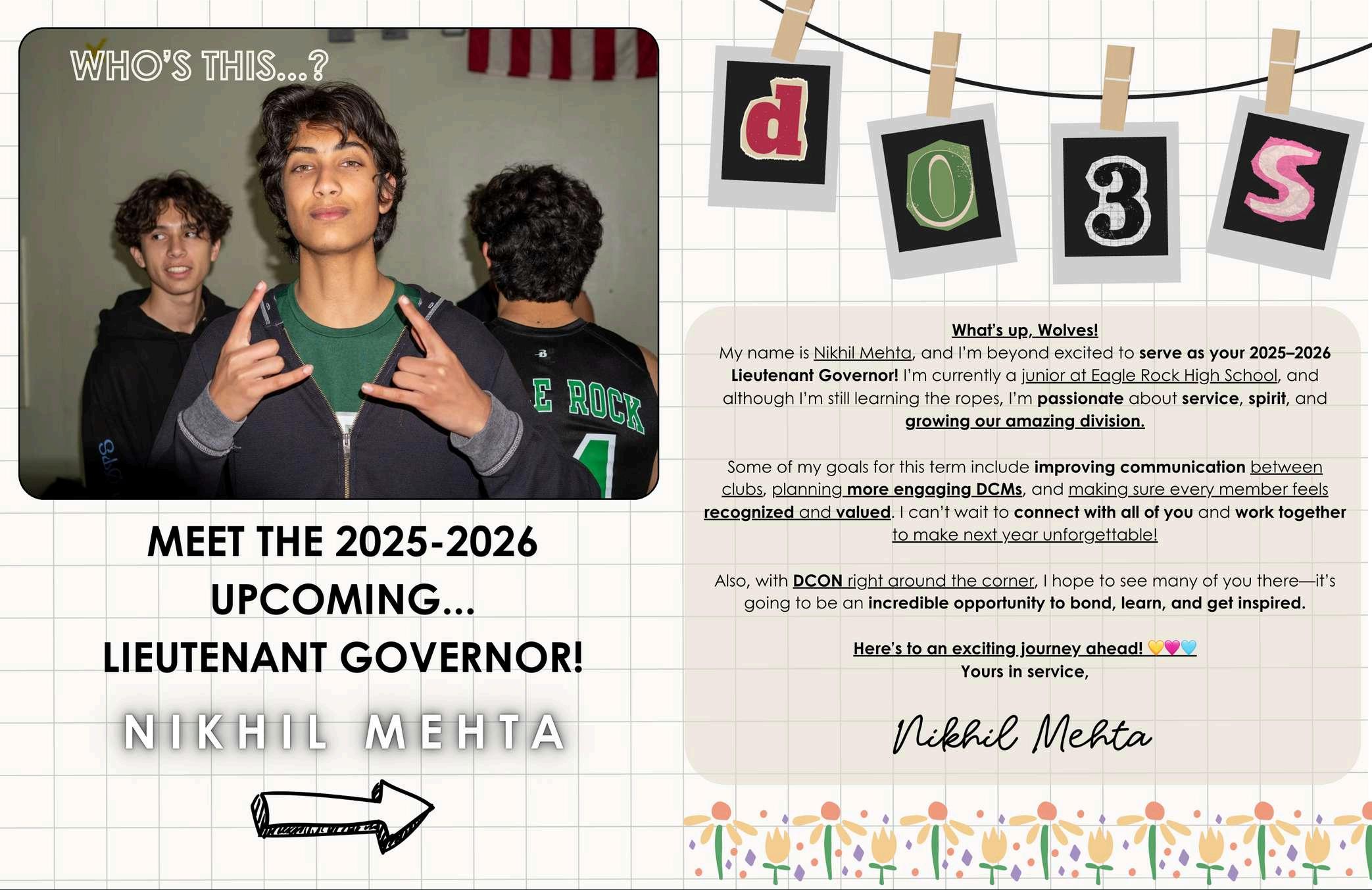 hour, and DCM from this term taught me such valuable lessons and everlasting memories that are what keep me motivated and inspired to keep growing. I am eternally thankful for my amazing DLT, who have stepped up to the challenge and did amazing this term! Watching you all grow as leaders and creating such unforgettable memories with you all is what this position is truly about—the love! My members, officers, advisors, and fellow DB Skibidibees have all taught me the vital role love plays into life, and I am beyond grateful that I had the best way to learn this. To my graduating seniors, whether this was your first year, fourth year, or anywhere in between, you all truly inspired me in countless ways I cannot describe, thank you for contributing time and effort in your final year in high school into our beloved division. I will truly miss being Lieutenant Governor and the alpha wolf, but it is now time to pass down the torch to Nikhil, who I know will accomplish so much in his term. Now, let’s save the tears for banquet/DCON and celebrate the final weeks of a year TANGLED IN SERVICE!