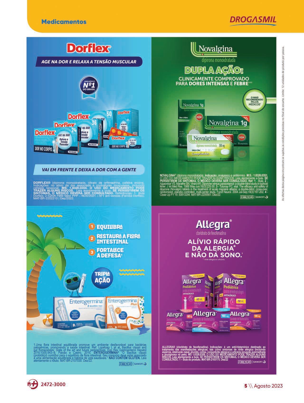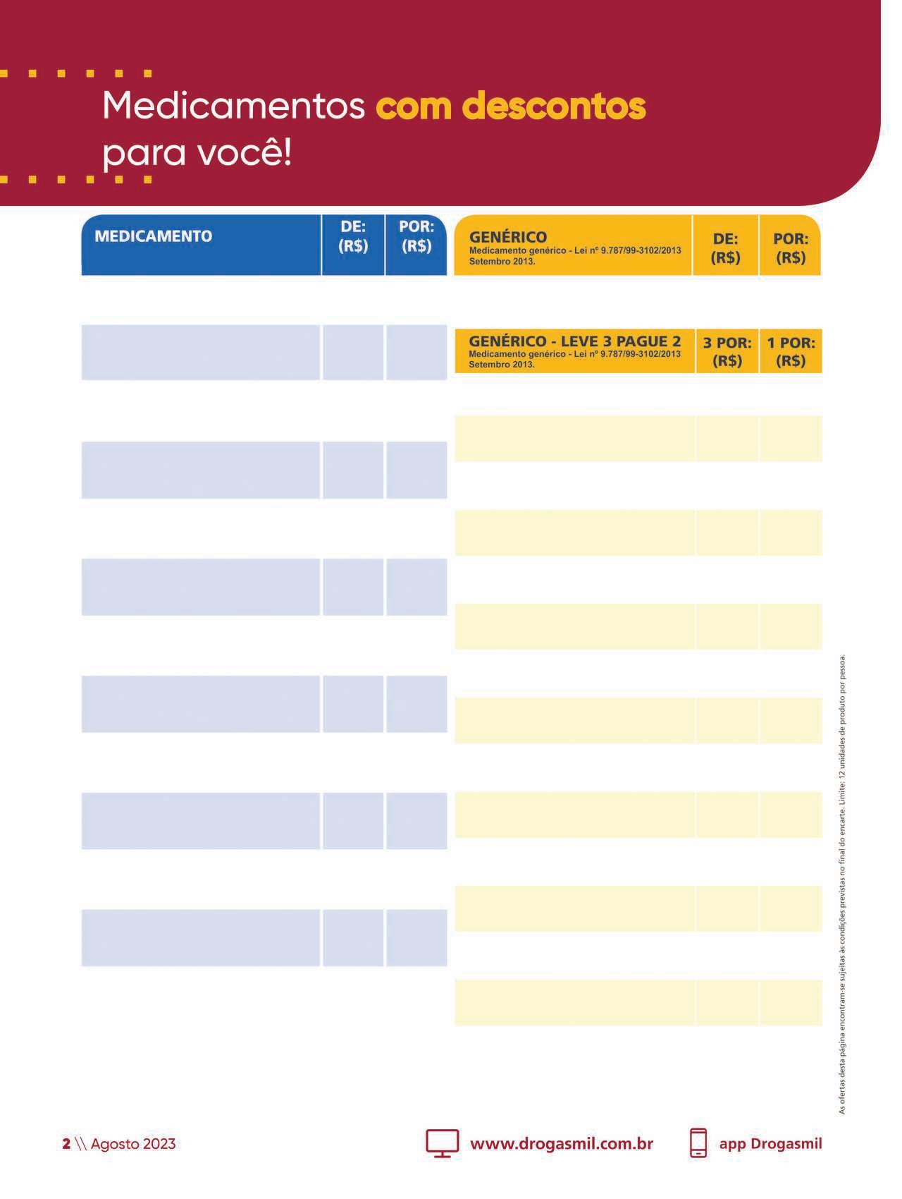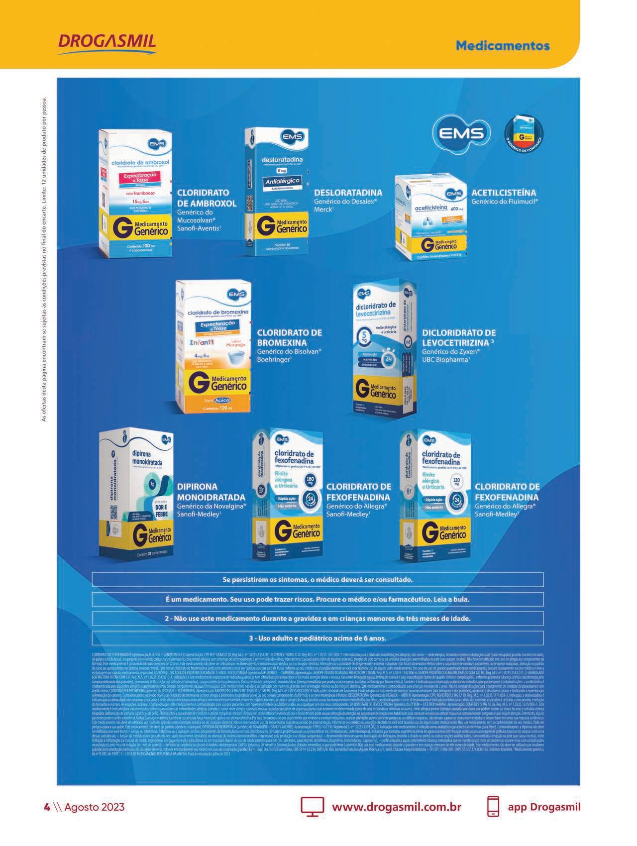 41,71 31,90 SALSEP JET SOLUÇÃO NASAL 9mg/ml 100ml Cloreto de Sódio Reg MS: Isento 185,14 121,99 IUMI 72 COMPRIMIDOS Drosperinona + Etinilestradiol Reg MS: 1003301540020 11,46 8,29 GLIFAGE XR 500mg 30 COMPRIMIDOS Cloridrato de Metformina Reg MS: 1008903400031 99,31 69,99 BENICAR ANLO 40+5mg 30 COMPRIMIDOS Olmesartana Medoxomila, Besilato de Anlopidino Reg MS: 1045401750057 50,69 39,59 KOIDE D XAROPE 120ml Maleato de Dexclorfeniramina, Betametasona Reg MS: 004313810018 62,82 47,99 PROLOPA BD 100+25mg 30 COMPRIMIDOS Levodopa Cloridrato de Benserazida Reg MS: 1010000640142 52,96 40,29 ANCORON 200mg 30 COMPRIMIDOS Cloridrato de Amiodarona Reg MS: 1003300010141 56,94 44,99 VITANOL-A 0,025% CREME DERMATOLÓGICO 30g Tretinoína Reg MS: 1010703400013 96,49 17,99 ARADOIS 50mg 60 COMPRIMIDOS Losartana Potássica Reg MS: 1097401210251 27,58 17,99 AEROLIN SPRAY 100mcg 200 DOSES Sulfato de Salbutamol Reg MS: 1010702260031 28,57 22,99 MICROVLAR 0,15 0,03mg 63 DRÁGEAS Levonorgestrel, Etinilestradiol Reg MS: 1049714930022 30,41 23,69 BUSONID 32mcg SUSPENSÃO NASAL 6ml 120 DOSES Budesonida Reg MS: 1121301730290 23,95 15,99 ASPIRINA PREVENT 30 COMPRIMIDOS Ácido Acetilsalicílico Reg MS : 1705600220037