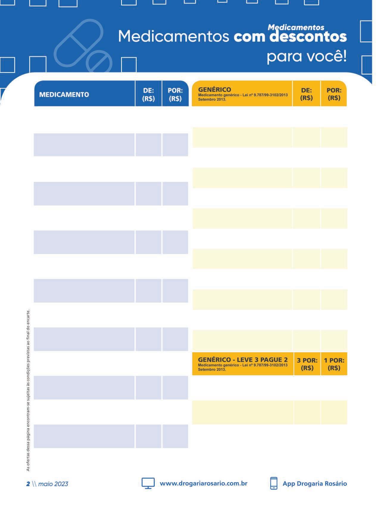 32,73 3,99 CITRATO DE SILDENAFILA 50mg 4 COMPRIMIDOS EMS Reg MS: 1023511170070 Ref : Viagra 9,10 3,49 ALBENDAZOL 400mg 1 COMPRIMIDO Prati Reg MS: 1256800520010 Ref : Zentel 18,50 8,99 DICLOFENACO DIETILAMÔNIO GEL 60g Cimed Reg MS: 1438101000020 Ref : Cataflam Emulgel 29,23 7,99 ACICLOVIR 50mg CREME 10g Cimed Reg MS: 1438101810014 Ref : Zovirax 72,74 19,99 ACICLOVIR 200mg 30 COMPRIMIDOS Prati Reg MS: 1256801630022 Ref : Zovirax 81,90 23,99 FINASTERIDA 1mg 30 COMPRIMIDOS EMS Reg MS: 1023506360029 Ref : Propecia TADALAFILA 20mg 4 COMPRIMIDOS 15,89 Medley. Reg. MS: 1832602360034. Ref.: Cialis. 31,78 LOSARTANA POTÁSSICA 50mg 30 COMPRIMIDOS 8,49 Germed. Reg. MS: 1058308280201. Ref.: Cozaar 16,98 201,45 95,39 ORLISTATE 120mg 42 COMPRIMIDOS Neo Química Reg MS:1558405270037 Ref : Xenical 20,40 10,59 IBUPROFENO 400mg 10 COMPRIMIDOS Medley Reg MS: 1832604840033 Ref : Advil PANTOPRAZOL 20mg 28 COMPRIMIDOS 9,59 Medley. Reg. MS: 1832601870039. Ref.: Pantozol. 19,18 19,85 11,69 DICLOFENACO DIETILAMÔNIO 10mg/g 60g Medley Reg MS: 1832601420017 Ref : Cata am 29,54 13,79 SULFATO DE NEOMICINA + BACITRACINA POMADA 50g Medley Reg MS: 1832600750021 Ref : Nebacetin 60,54 45,99 PROLOPA BD 100 + 25mg 30 COMPRIMIDOS Levodopa, Cloridrato De Benserazida Reg MS: 1010000640142 41,60 39,99 HILUROPT 1,5mg GOTAS 10ml Hialuranato de Sódio Reg MS: 1542303260011 97,27 67,99 CONCOR 5mg 30 COMPRIMIDOS Hemifuramato de Bisoprolol Reg MS: 1008901940039 48,64 39,99 KOIDE D XAROPE 120ml Maleato de Dexclorfeniramina, Betametasona Reg MS: 004313810018 95,72 67,59 BENICAR ANLO 40+5mg 30 COMPRIMIDOS Olmesartana Medoxomila, Besilato de Anlopidino Reg MS: 1045401750057 11,05 8,49 GLIFAGE XR 500mg 30 COMPRIMIDOS Cloridrato de Metformina Reg MS: 1008903400031 178,45 112,39 IUMI 72 COMPRIMIDOS Drosperinona + Etinilestradiol Reg MS : 1003301540020 73,99 51,99 MOTILEX 30 CÁPSULAS Colágeno não Hidrolisado tipo II em cápsulas Reg MS: 6227405940014 39,92 27,99 AZUKON MR 30mg 60 COMPRIMIDOS Glicazida Reg MS: 1052500190044 54,88 47,89 VITANOL-A 0,025% CREME DERMATOLÓGICO 30g Tretinoína Reg MS: 1010703400013 27,53 21,89 MICROVLAR 0,15 0,03mg 63 DRÁGEAS Levonorgestrel, Etinilestradiol Reg MS: 1049714930022 29,31 22,99 BUSONID 32mcg SUSPENSÃO NASAL 6ml 120 DOSES Budesonida Reg MS: 1121301730290 54,87 31,99 BETNOVATE 1mg CREME 30g Valerato de Betametasona Reg MS: 1010702330046 95,53 15,49 ARADOIS 50mg 60 COMPRIMIDOS Losartana Potássica Reg MS: 1097401210251 15,58 5,49