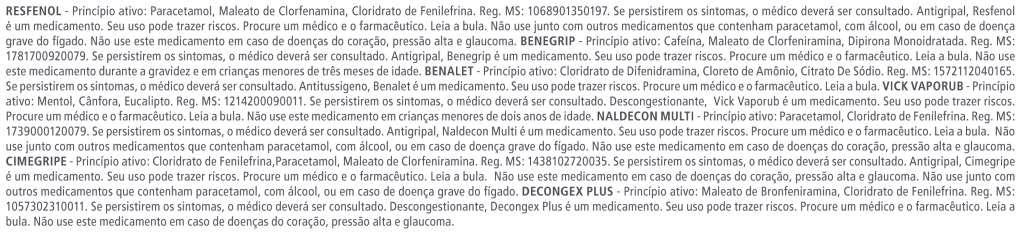 Todos os produtos presentes nesta lista são medicamentos Seu uso pode trazer riscos Procure o médico ou o farmacêutico Leia a bula Se persistirem os sintomas, o médico deverá ser consultado Evite a automedicação Torsilax - Não use junto com outros medicamentos que contenham paracetamol, com álcool, ou em caso de doença grave do fígado Ibuprofeno - Não use este medicamento em casos de úlcera, gastrite, doença dos rins ou se você já teve reação alérgica a antiin amatórios Dipirona sódica - Não use este medicamento durante a gravidez e em crianças menores de três meses de idade
