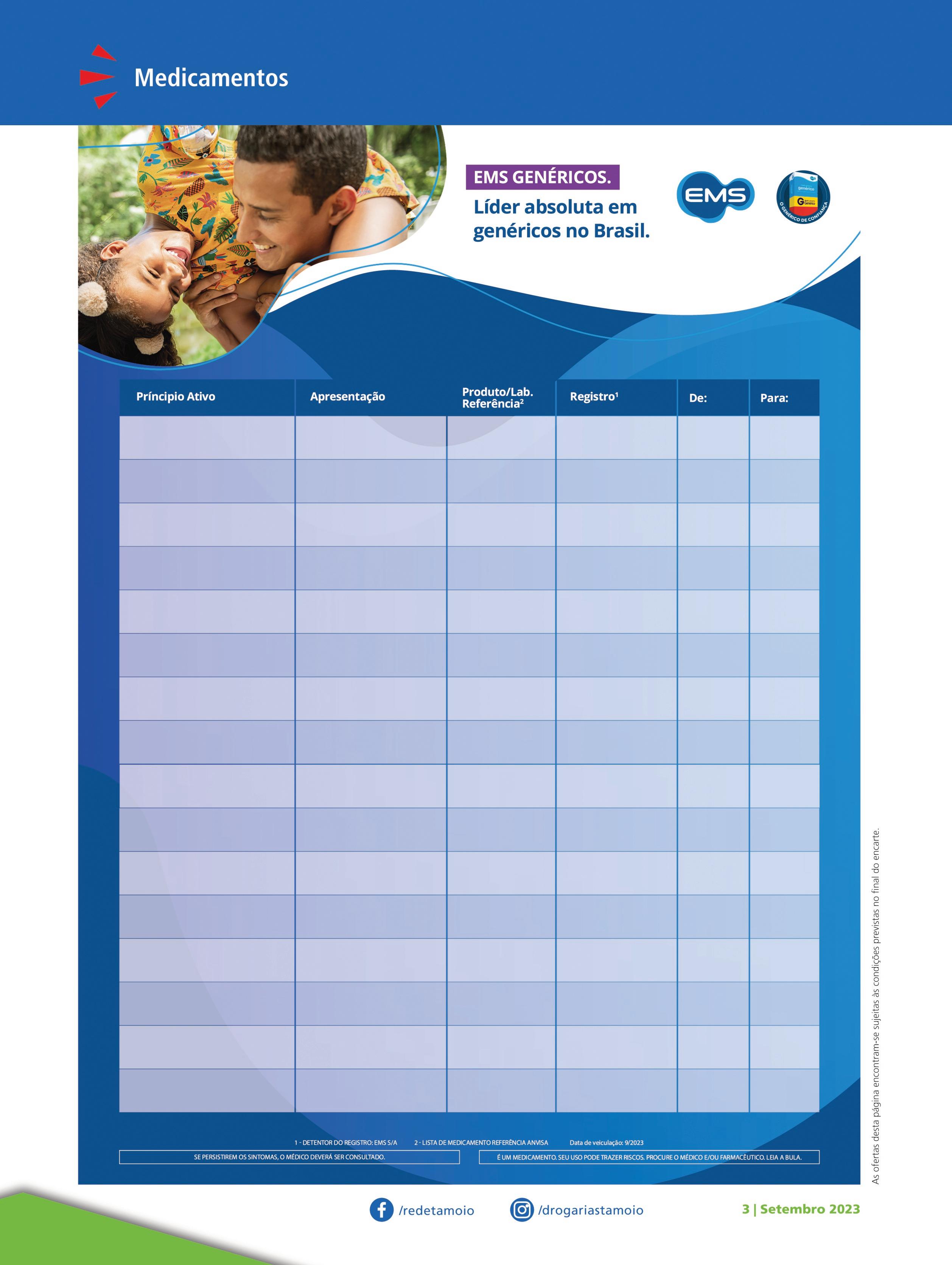 29,54 SULFATO DE NEOMICINA + BACITRACINA POMADA 50g Medley Reg MS: 1832600750021 Ref : Nebacetin 15,99 39,25 SINVASTATINA 20mg 30 COMPRIMDOS Biolab Reg : MS: 1097402630058 Ref : Zocor 5,99 LOSARTANA POTÁSSICA 50mg 30 COMPRIMIDOS 3,49 Biosintética Reg MS: 1057305340033 6,98 FLUCONAZOL 150mg 2 CÁPSULAS 3,99 Cimed Reg MS: 1438101140027 Ref:: Zoltec 7,98 ATORVASTATINA CÁLCICA 10mg 30 COMPRIMIDOS 17,99 Eurofarma Reg MS: 1004311370029 Ref : Citalor 35,98 ATORVASTATINA CÁLCICA 20mg 30 COMPRIMIDOS 26,99 Eurofarma Reg MS: 100431075006-5 Ref : Citalor 53,98 FUROSEMIDA 40mg 30 COMPRIMIDOS 9,99 Biossintética Reg MS: 1057305820019 Ref: Lasix 19,98 OLMESARTANA MEDOXOMILA 20mg 30 COMPRIMIDOS 44,99 Eurofarma Reg MS : 1004311360031 Ref: Benicar HCT 89,98 OLMESARTANA MEDOXOMILA 40mg 30 COMPRIMIDOS 47,99 Eurofarma Reg MS : 1004311360082 Ref: Benicar HCT 95,98 BESILATO DE ANLODIPINO 5mg 30 COMPRIMIDOS 5,99 Cimed Reg M S : 1438101610023 Ref : Norvasc 11,98 DICLOFENACO DIETILAMÔNIO 10mg/g 60g 11,39 Medley Reg MS: 1832601420017 Ref : Cata am 22,78 PANTOPRAZOL 20mg 28 COMPRIMIDOS 9,99 Medley Reg MS: 1832601870039 Ref : Pantozol 19,98 NISTATINA + ÓXIDO DE ZINCO POMADA 60g 10,99 Medley Reg MS: 1832601510024 Ref : Dermodex 21,98 HIDROCLOROTIAZIDA 25mg 30 COMPRIMIDOS 2,99 Medley Reg MS: 1832604300063 Ref : Clorana 5,98 DICLOFENACO POTÁSSICO 50mg 20 COMPRIMIDOS 6,99 Medley Reg MS: 1832601030014 Ref : Cata am 13,98 50,69 KOIDE D XAROPE 120ml Maleato de Dexclorfeniramina Betametasona Reg MS :1004313810018 39,59 11,46 GLIFAGE XR 500mg 30 COMPRIMIDOS Cloridrato de metformina Reg MS : 1008903400031 8,29 52,96 ANCORON 200mg 30 COMPRIMIDOS Cloridrato de Amiodarona Reg MS : 1003300010141 40,29 99,31 BENICAR ANLO 40+5mg 30 COMPRIMIDOS Olmesartana Medoxomila, Besilato de Anlopidino Reg MS: 1045401750057 69,99 185,14 IUMI 72 COMPRIMIDOS Drosperinona + Etinilestradiol Reg MS: 1003301540020 121,99 62,82 PROLOPA BD 100+25mg 30 COMPRIMIDOS Levodopa, Cloridrato de Benserazida Reg MS : 1010000640142 47,99 41,71 SALSEP JET SOLUÇÃO NASAL 9mg/ml 100ml Cloreto de Sódio Reg MS: Isento 31,90 109,90 MOTILEX 60 CÁPSULAS Colágeno Reg MS: ISENTO 99,09 50,86 FLANCOX 500mg 14 COMPRIMIDOS Etodolaco Reg MS: 1011801460043 32,99 27,58 AEROLIN SPRAY 100mcg 200 DOSES Sulfato de Salbutamol Reg MS : 1010702260031 16,99 56,94 VITANOL-A 0,025% CREME DERMATOLÓGICO 30g Tretinoína Reg MS : 1010703400013 44,99 28,57 MICROVLAR 0,15 0,03mg 63 DRÁGEAS Levonorgestrel, Etinilestradiol Reg MS : 1049714930022 22,99 74,21 EBASTEL 1mg XAROPE 60ml Ebastina Reg MS: 1004307600031 62,09 72,35 EBASTEL 10mg 10 COMPRIMIDOS Reg MS: 1004307600015 58,99 30,41 BUSONID 32mcg SUSPENSÃO NASAL 6ml 120 DOSES Budesonida Reg MS : 1057305900136 23,39