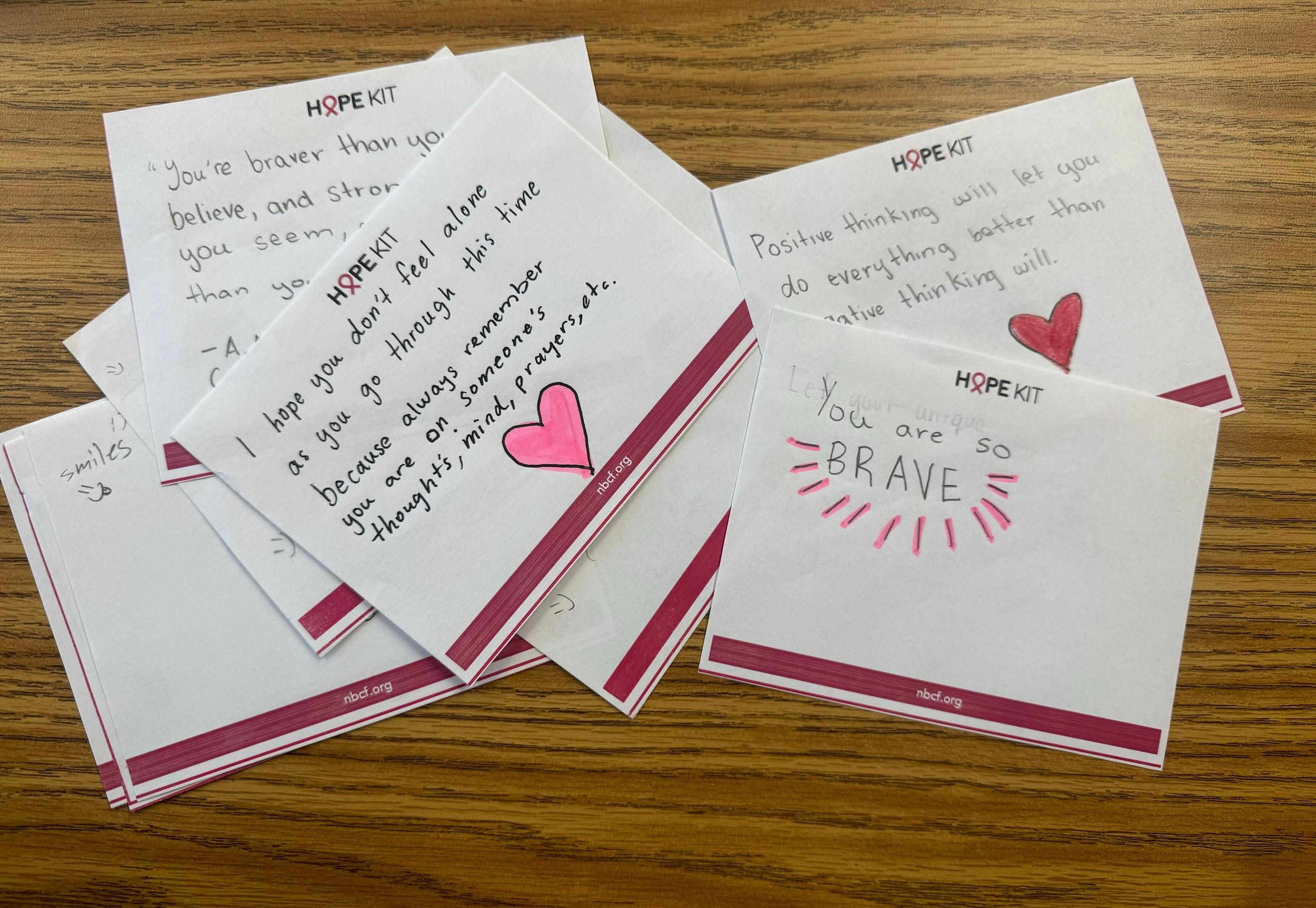 The Hope Kit Service event was in partnership with the National Breast Cancer Organization. Each Key Club member received 2 slips of paper that were provided on the organization's website. With each slip, the Key Club members wrote a kind and encouraging note in light of Breast Cancer Awareness month which is October. In total, there were 60 people in attendance and the main demographic included current Sophomores and Seniors. We started the meeting with a general overview of what Key Club is and various upcoming events such as our