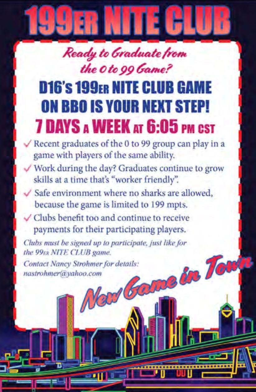 21-24 Spring 499er NLM Sectional September 21-24 Austin Fall Sectional October 5-7 Beaumont Sabine Neches Fall Sectional October 11-14 Diane Olson Election Sectional October 13-15 Fort Western Sectional October 16-22 District 16 Royal Sectional Tournament at Clubs (STaC) October 27-29 Houston Unit 174 Sectional and I/N Regional October 30-November 5 Puerto Vallarta Regional November 1-3 Denton Turkey Trot Pairs Sectional November 4-5 Austin Fall NLM Sectional Novermber 6-12 STaC Unit 174 (D16) Sectional Tournament at Clubs November 15-18 Dallas Fall Sectional November 16-19 Houston (Spring) 499er/NLM Sectional ACBL District