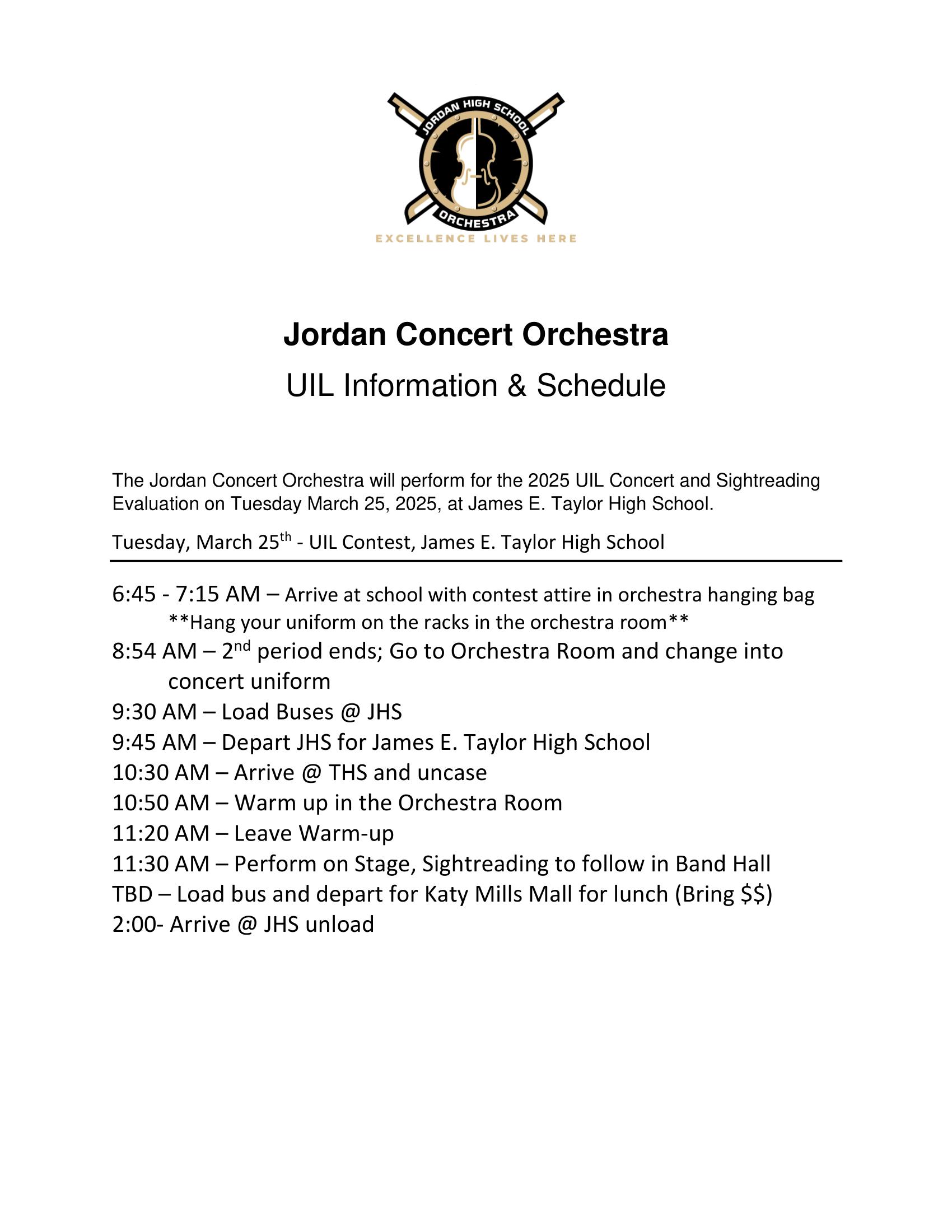 As individual performers, students in the orchestra have reached great heights. Members of the orchestra have performed with the TMEA All-State Orchestras at the annual Clinic and Convention in San Antonio, TX, TMEA All-Region Orchestras and the Houston Youth Symphony! March 2023, the Symphony Orchestra placed 1st in the Full Orchestra division of the National Orchestra Festival held in conjunction with the American String Teacher’s Association National Conference in Orlando, FL. In the fall of 2023 the Jordan High School Symphony Orchestra and the Jordan High School Sinfonia Orchestra were both named National Winners in the Mark of Excellence National Orchestra Honors project and the Jordan High School Sinfonia Orchestra was named 1st Runner-Up in the TMEA Honor String Orchestra Competition. All six of our string orchestras received Sweepstakes at UIL Concert and Sightreading Evaluation in Spring of 2024. And the Jordan High School Symphony has been invited to perform at the 2024 Midwest International Band and Orchestra Clinic in Chicago this upcoming December.
