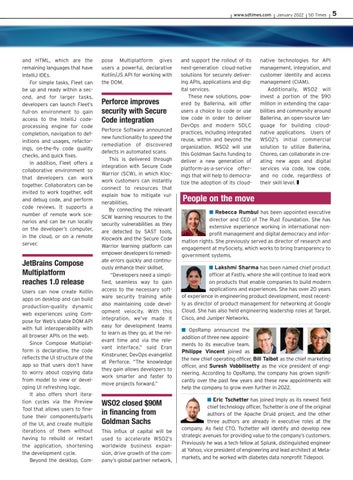 native technologies for API management, integration, and customer identity and access management (CIAM). Additionally, WSO2 will invest a portion of the $90 million in extending the capabilities and community around Ballerina, an open-source language for building cloudnative applications. Users of WSO2’s initial commercial solution to utilize Ballerina, Choreo, can collaborate in creating new apps and digital services via code, low code, and no code, regardless of their skill level. z