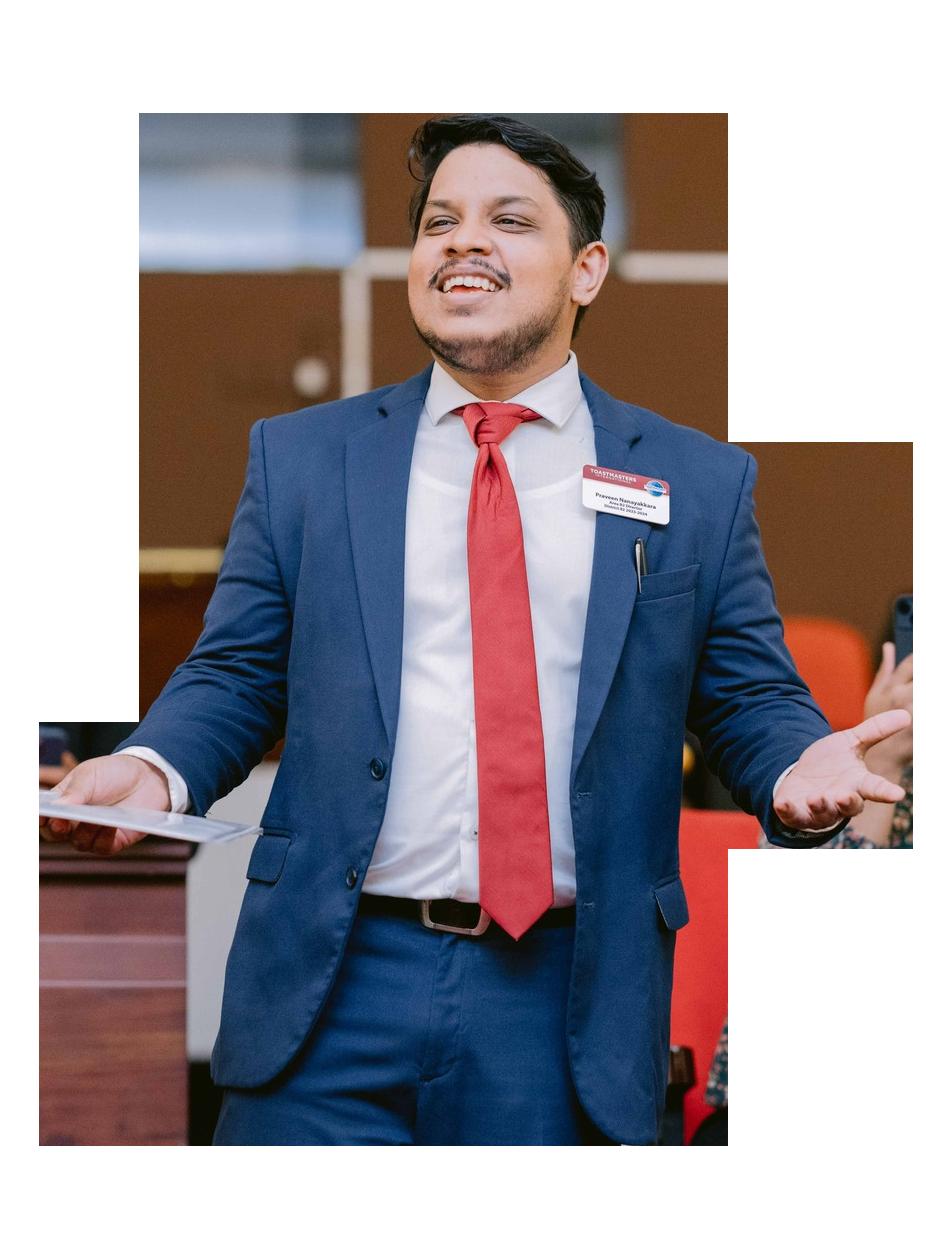 Q: What would you say to our new members who are looking forward to contesting soon? You are in for a treat! Competing is an amazing opportunity for you to find out who you are as a speaker. It will push you past the limits you thought you had. And the more time you spend on stage, the more comfortable you become, and inadvertently, it will fuel up your confidence. Enjoy the process and always have the most possible fun.