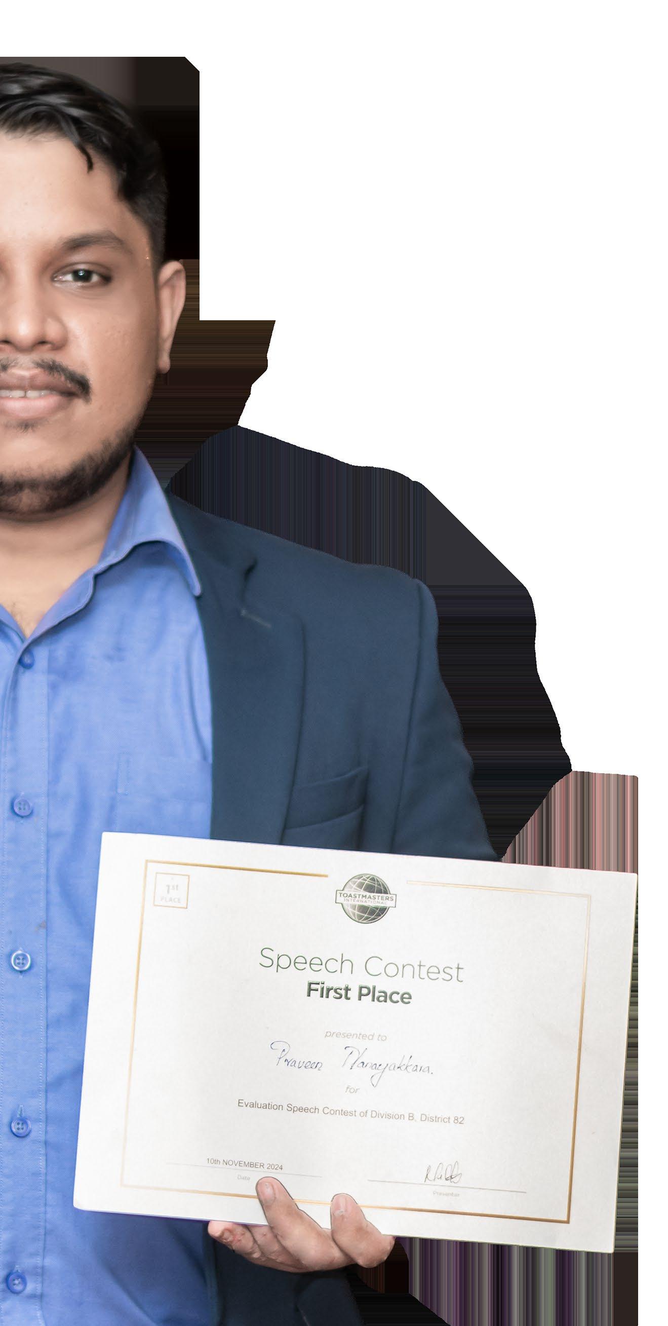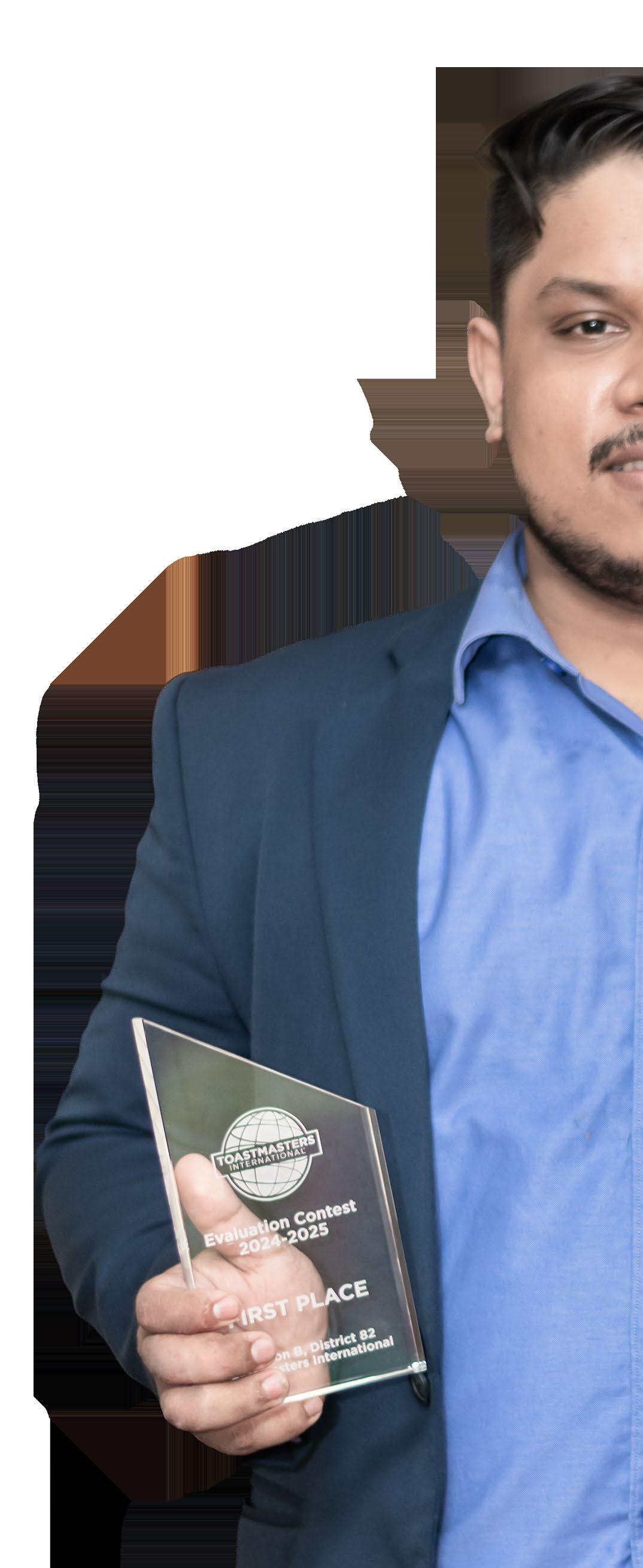 Such significant endeavours demand unwav ering commitment from members and excel lent leadership. The leadership exemplified by Nishedha and her team, and the dedication shown by all members of the club are truly commendable. It is through your collective ef forts and steadfast determination that District 82 continues to thrive. You also achieved the Smedley Award this year, contributing to Dis trict 82 being recognised for having the high est number of Smedley Award winning clubs in Toastmasters International. Beyond that, I am sure that every member – new and existing – continues to provide their unique contribu tions to forming the ethos of your club.