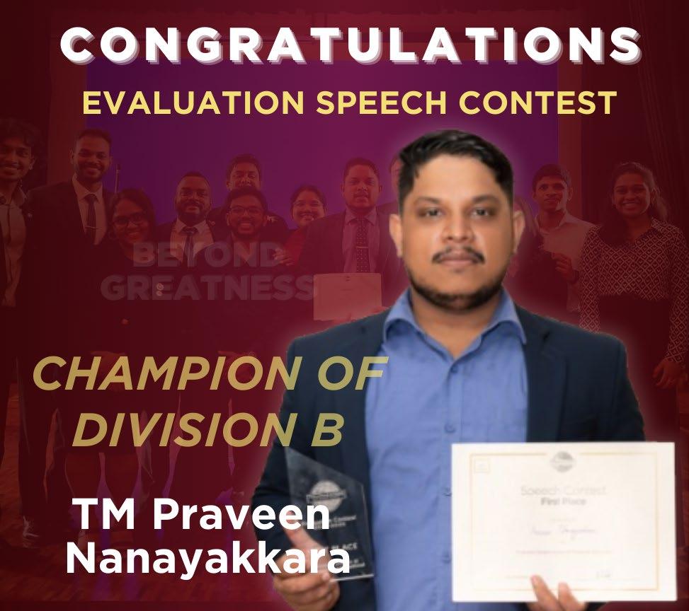 CCTMC’s evaluation powerhouse TM Praveen Nanayakkara walked away with the Division B Championship in Evaluation Speech on the 10th of November 2024. Weeks of hard work and practice paid off - and CCTMC will be right by Praveen’s side as he prepares for the District Semi Finals!