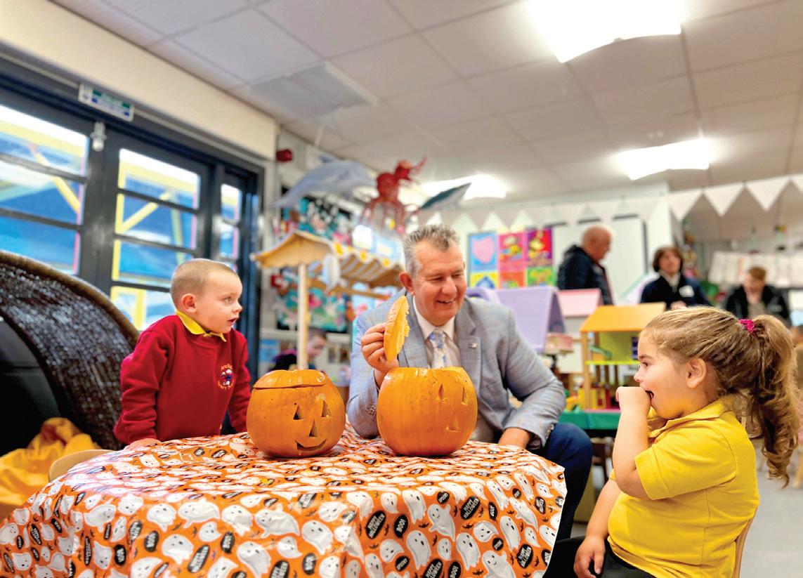 Environment Minister Edwin Poots helps Georgia Aiken and Charlie Patrick with their pumpkin carving during a visit to Arellian Nursery School in Belfast.