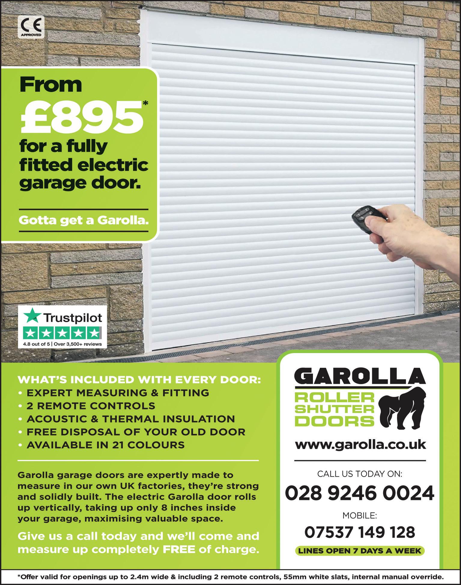 of your property and will always be on hand to answer any questions you might have. Offering style as well as substance, Garolla electric garage doors are available in 21 colours and come in two different slat sizes to perfectly fit any opening. Avoid any hidden charges with Garolla, where an instant quote comes inclusive of measuring, fitting and VAT. For more information visit their website www.Garolla. co.uk or, alternatively, give them a call on 028 9246 0024 or mobile 07537 149 128