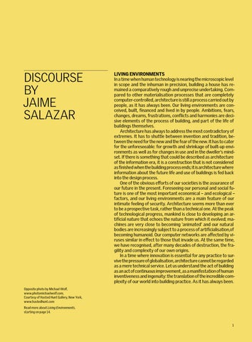 Living Environments In a time when human technology is nearing the microscopic level in scope and the inhuman in precision, building a house has remained a comparatively rough and unprecise undertaking. Compared to other materialisation processes that are completely computer-controlled, architecture is still a process carried out by people, as it has always been. Our living environments are conceived, built, financed and lived in by people. Ambitions, fears, changes, dreams, frustrations, conflicts and harmonies are decisive elements of the process of building, and part of the life of buildings themselves. Architecture has always to address the most contradictory of extremes. It has to shuttle between invention and tradition, between the need for the new and the fear of the new. It has to cater for the unforeseeable: for growth and shrinkage of built-up environments as well as for changes in use and in the dweller’s mindset. If there is something that could be described as architecture of the information era, it is a construction that is not considered as finished when the building process ends; it is architecture where information about the future life and use of buildings is fed back into the design process. One of the obvious efforts of our societies is the assurance of our future in the present. Foreseeing our personal and social future is one of the most important economical – and ecological – factors, and our living environments are a main feature of our intimate feeling of security. Architecture seems more than ever to be a prospective task, rather than a technical one. At the peak of technological progress, mankind is close to developing an artificial nature that echoes the nature from which it evolved; machines are very close to becoming ‘animated’ and our natural bodies are increasingly subject to a process of artificialisation,of becoming humanoid. Our computer networks are affected by viruses similar in effect to those that invade us. At the same time, we have recognised, after many decades of destruction, the fragility and complexity of our own origins. In a time where innovation is essential for any practice to survive the pressure of globalisation, architecture cannot be regarded as a mere technical service. Let us understand the act of building as an act of continuous improvement, as a manifestation of human inventiveness and ingenuity: the translation of the incredible complexity of our world into building practice. As it has always been.