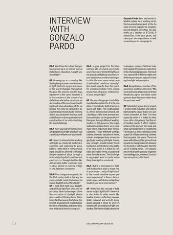 Interview with Gonzalo Pardo D&A What have the culture that you have grown up in, as well as your architectural education, taught you about light? GP Growing up in a country like Spain gives you some consciousness of light, that is to say you are aware of the way it changes. Throughout the year, the seasons and the days, light never is the same. However, it is the teachers at the school of architecture who imbue us with an understanding of the need to work with light and take advantage of its potential. Not only by taking it in account in projects but also by working with it as a parameter that has a critical influence on the organisation and construction of an entire building. It’s a real challenge. D&A Have you yourself come across any properties of light that have had a particular influence on your work? GP Now I’m interested in working with light as a material, like brick or concrete, and exploring its possibilities. I think that in every project, light should be allowed to change the perception of place through a rich variety of spatial conditions and contrasts, i.e. through dualities like dark vs light, public vs private, open vs close, interior vs exterior or high vs low, lightness vs massive. D&A What changes do you predict for the 21st century both in the way humans use light, and in the balance between daylight and artificial light? GP I think that right now, daylight and artificial light have the same importance. New technologies allow the recreation of daylight atmospheres with artificial systems. This is important because in the future, this kind of development could change the form of buildings and generate a new thinking in how to use space.