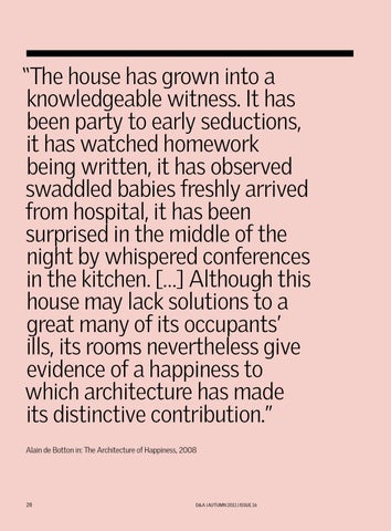 “The house has grown into a knowledgeable witness. It has been party to early seductions, it has watched homework being written, it has observed swaddled babies freshly arrived from hospital, it has been surprised in the middle of the night by whispered conferences in the kitchen. […] Although this house may lack solutions to a great many of its occupants’ ills, its rooms nevertheless give evidence of a happiness to which architecture has made its distinctive contribution.” Alain de Botton in: The Architecture of Happiness, 2008