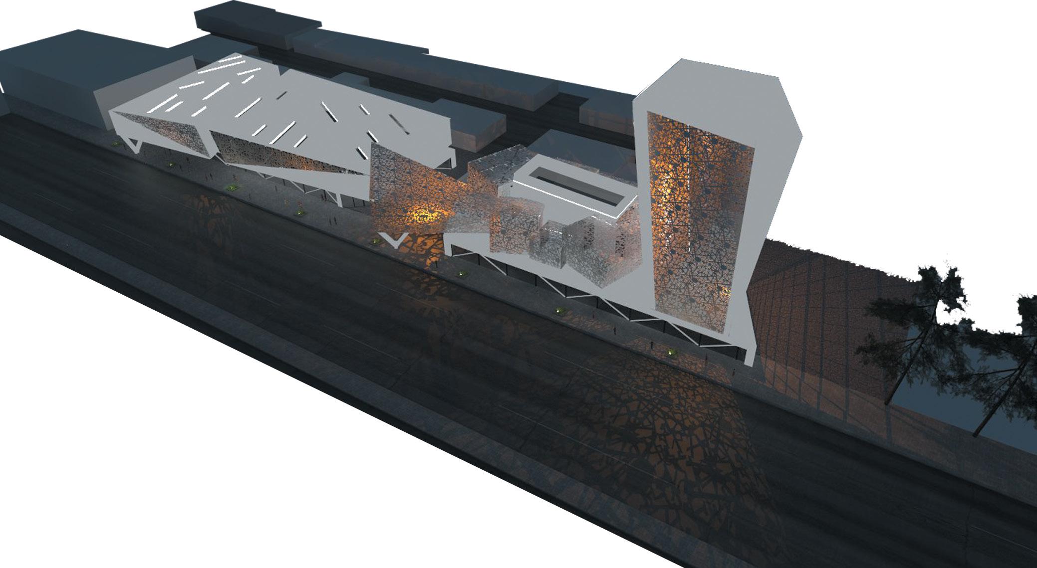 The first step in generating the facade pattern was to use the street grid of the old city. This initial pattern was then refined and transformed through a series of geometric operations to reach the final design.
