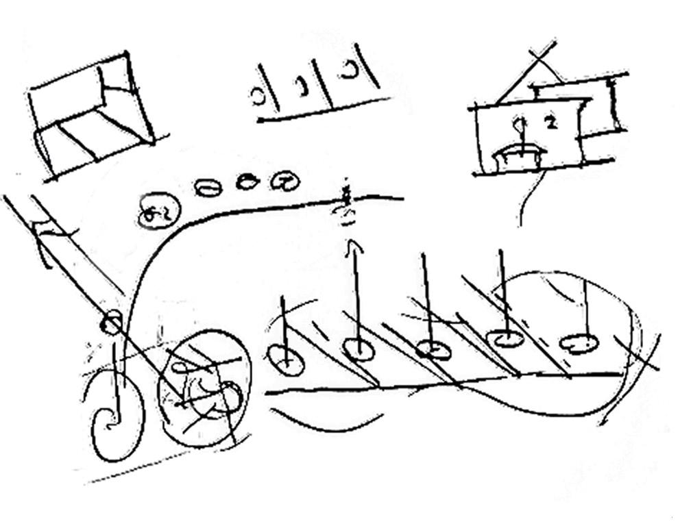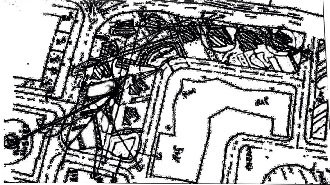 The superposition of both elements, along with the introduction of a circle representing the knot in the road grid, led to the creation of the final pattern.