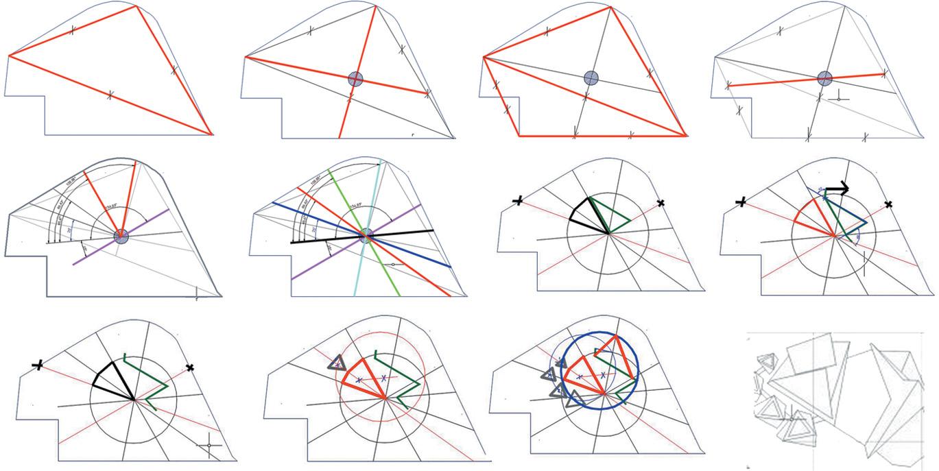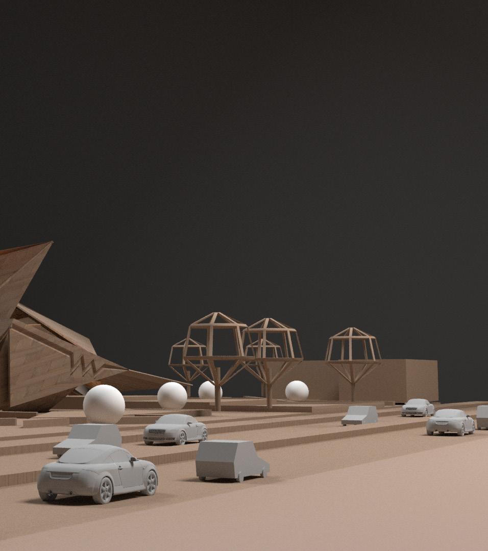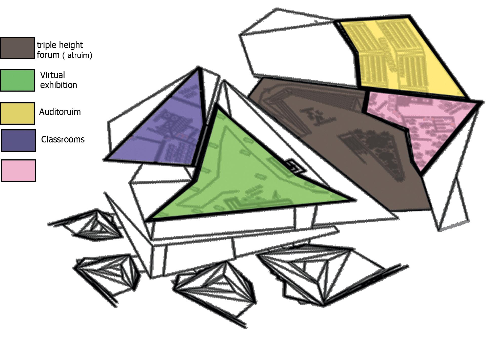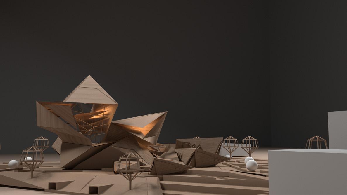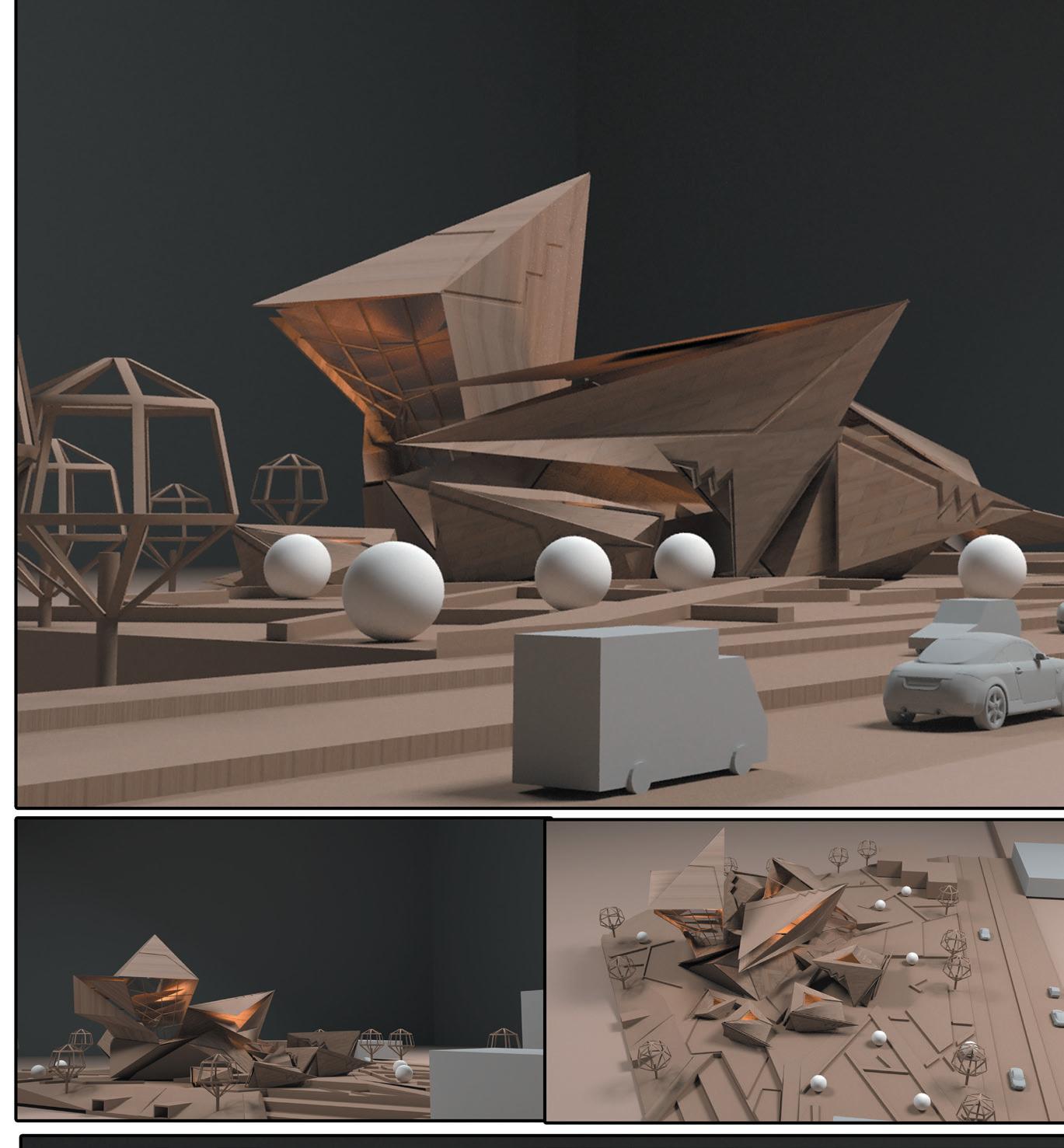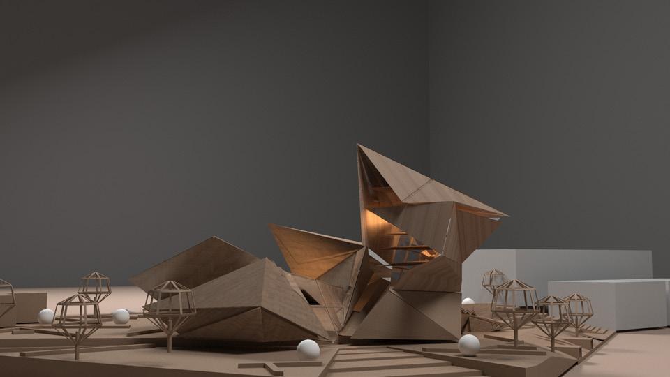 Geometric shapes such as triangles, squares, and rectangles were manipulated through geometric operations like subtraction, addition, and reorientation to create a dynamic spatial arrangement that responds to both the site and the intended function of the center.