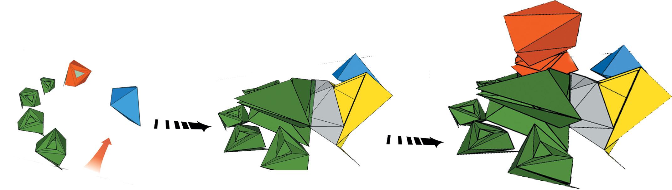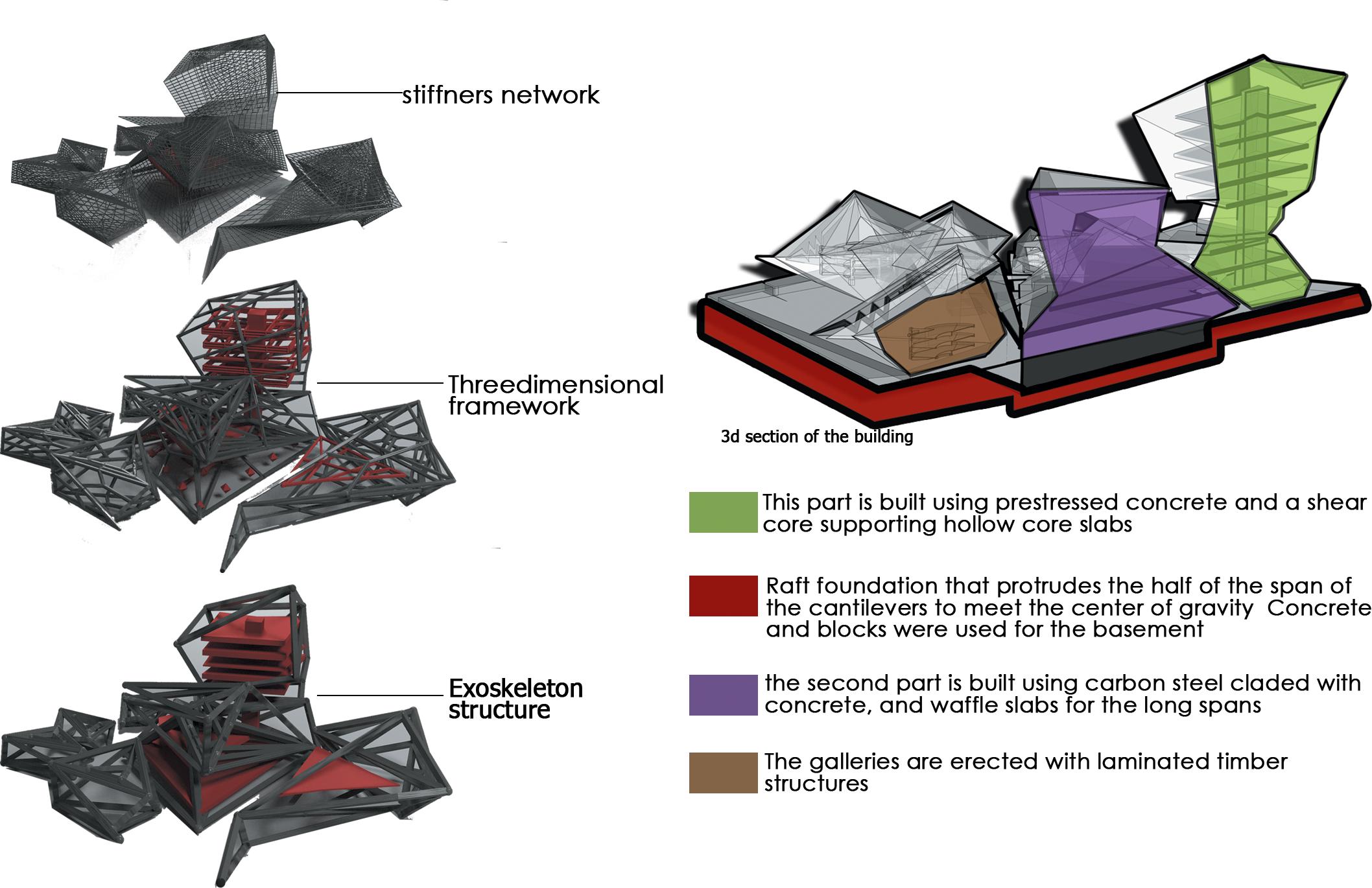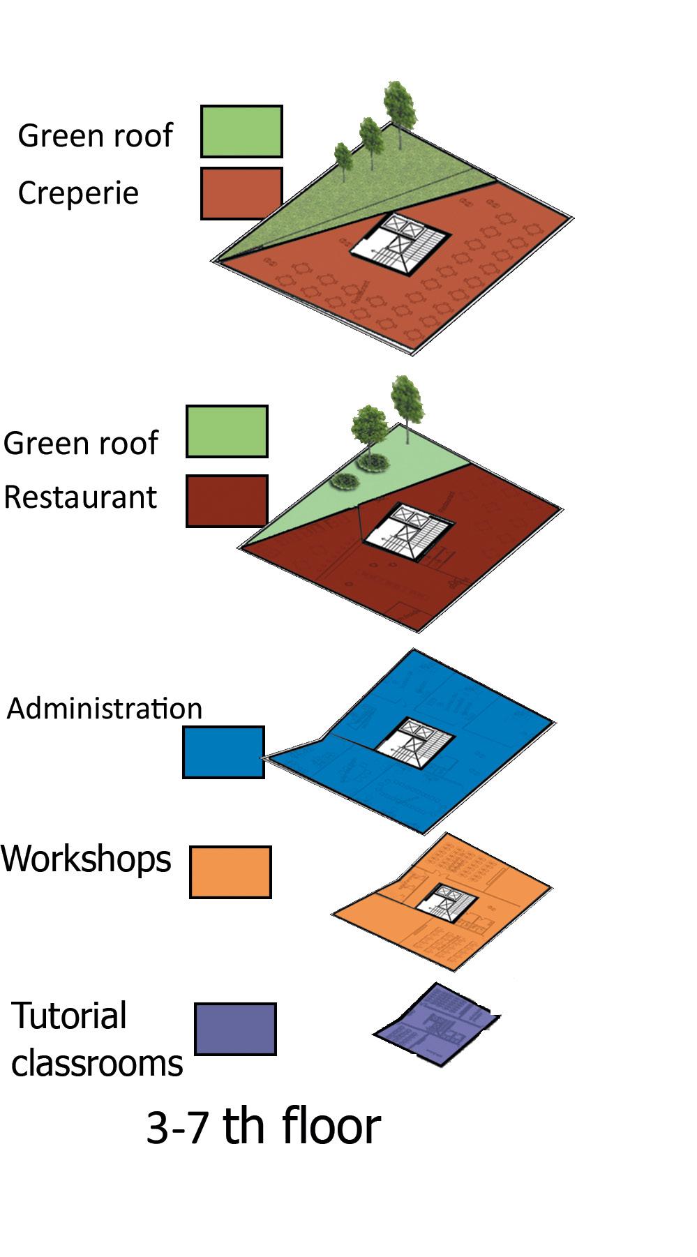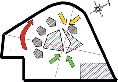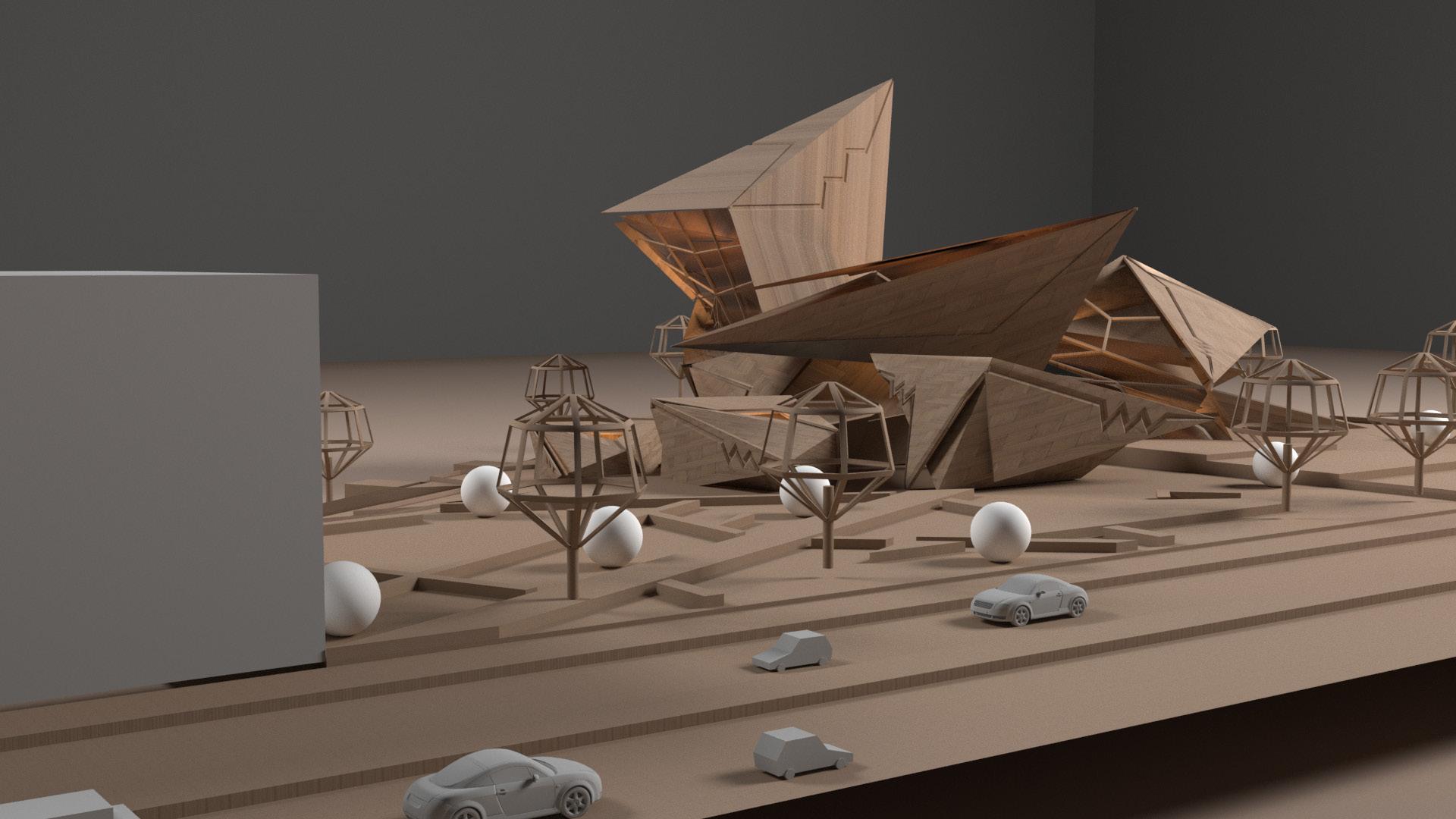 Geometric shapes such as triangles, squares, and rectangles were manipulated through geometric operations like subtraction, addition, and reorientation to create a dynamic spatial arrangement that responds to both the site and the intended function of the center.