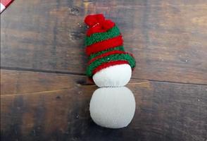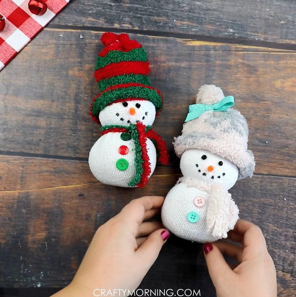 s://www craftymorning com/easy-sock-snowmen/ Largewhitesock Fuzzysock Orange/blackpipecleaner Hotgluegun Blacksharpie Twine 2-3Buttons Youneed Cutthelargewhitesockalittleabovewhere theheelgoes Fillwithsomerice Tieaknotatthetopofthesock Cut2tinypiecesofblackpipecleaner,puta dotofhotglueonthesnowman'sfaceand stickthepipecleanerthroughwhereyou wanttheeyes Repeat Cutasmallpieceof orangepipecleanerforthenose Hotglue andstickin Useapieceoftwineandtieitaroundthesock soitcreates2partstothesnowman Cutthefuzzysockontheendforthehat Put itontopofthericesockandtietwinearound thetiptomakeapompomtypehat Cuta stripforthescarfwiththefuzzysock Useasharpieandmakethesnowman's mouth Tiethescarfaroundtheneck Hotglue onbuttons StepOne StepFour StepThree StepTwo SOCK SNOWMEN 6