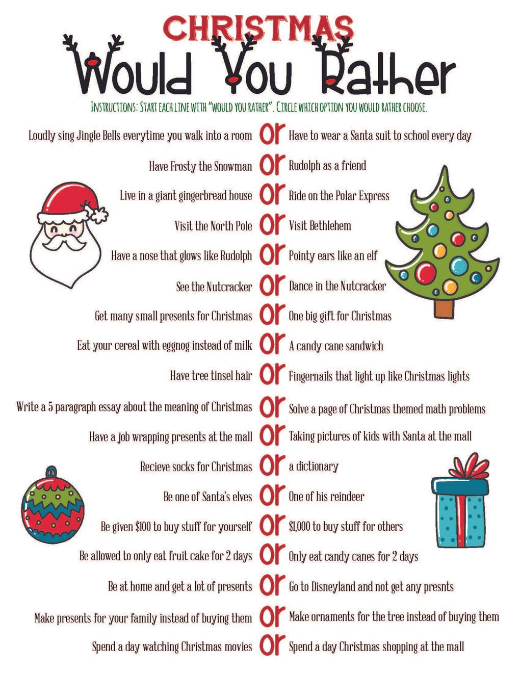 - Letter to Santa - Build a Reindeer - Build a Santa - Colour Me in One - Colour Me in Two - Colour Me in Three - Copy the Reindeer - Spot the Difference - Christmas Maze - Christmas Word Search - Christmas Crossword - Christmas Ispy - Christmas Connect the Dots - Finish the Phrase - Would you Rather - 100 Acts of Kindness