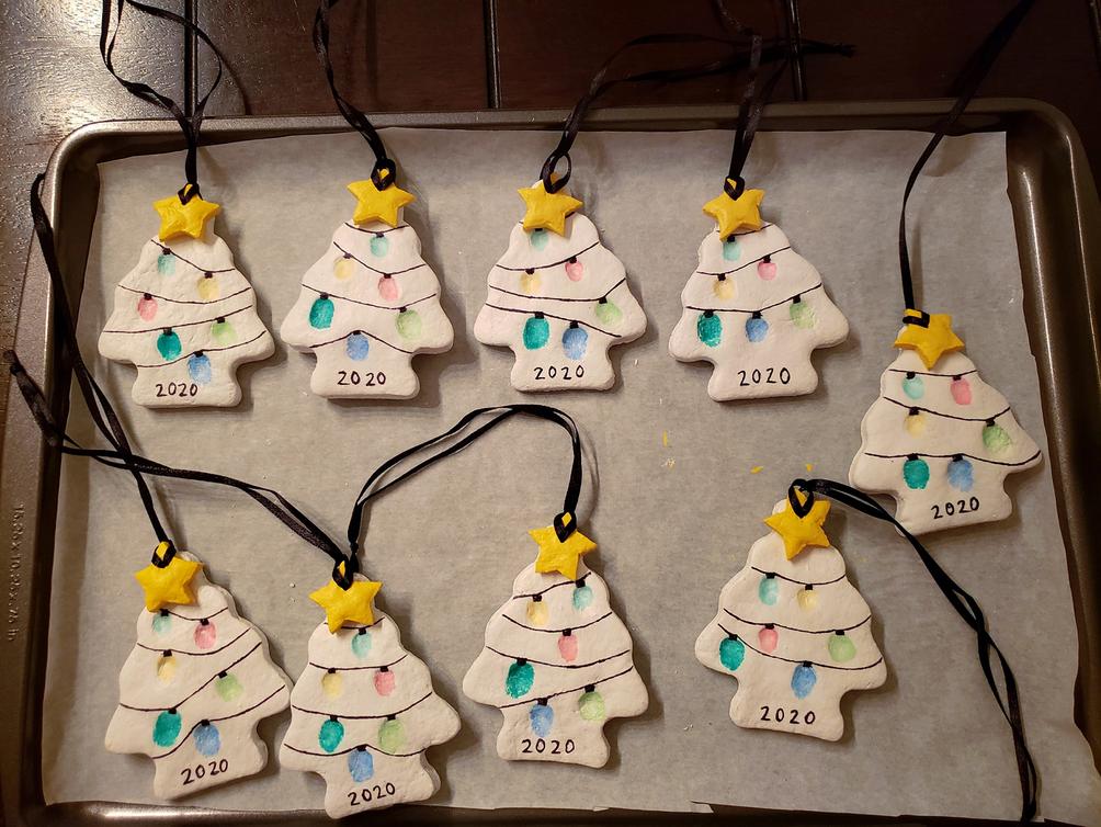 s://www craftymorning com/salt-dough-fingerprint-christmas-tree-ornaments/ 8 Inkpad 4cupsallpurposeflour(notselfrising) 1cuptablesalt 2cupswarmwater Acrylicpaint Ribbon/string Cookiecutter(orcardboard) Thintipblacksharpie ModPodge Mixthesaltdough Inabowl,mixtheflour,saltandwarmwater Kneadit withyourhanduntilallcombined Usearollingpinto rollitoutflat Decorate Havethekidspresstheirfingerprintsonthetree Pokea holeontopofthetreeandstarwithapencilorstraw StepOne StepThree StepTwo Cuttheshape Useatreecookiecutterandpressitintothedough Thencutastarshapeoutofcardboardfortracingthe startoppers(butyoucoulduseatinycookiecutter) If youdon'thaveatreecookiecutteryoucanusedrawa treeintothecardboardandusethistotracetheshape Bake Bakeat250degreesfor3hours,flippinghalfway StepFour Letthemcoolforafewhoursthenuseacrylicpaint forthestar Havethekidsdiptheirfingeronanink padandpressitintotheindentstheymade Usethesharpieanddrawstringlinesbetweenall thefingerprintlights Writetheyearornameandsealwithmodpodge Tiearibbonandyou'redone! Startdecorating StepFive
