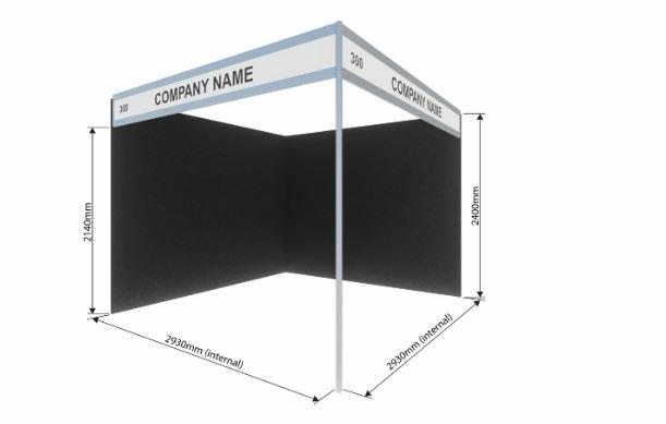 FASCIA SIGNAGE: Two 240mm High WHITE panels with 90mm High BLACK lettering displaying your company name. Fascia signs are provided to all open sides of your booth.
