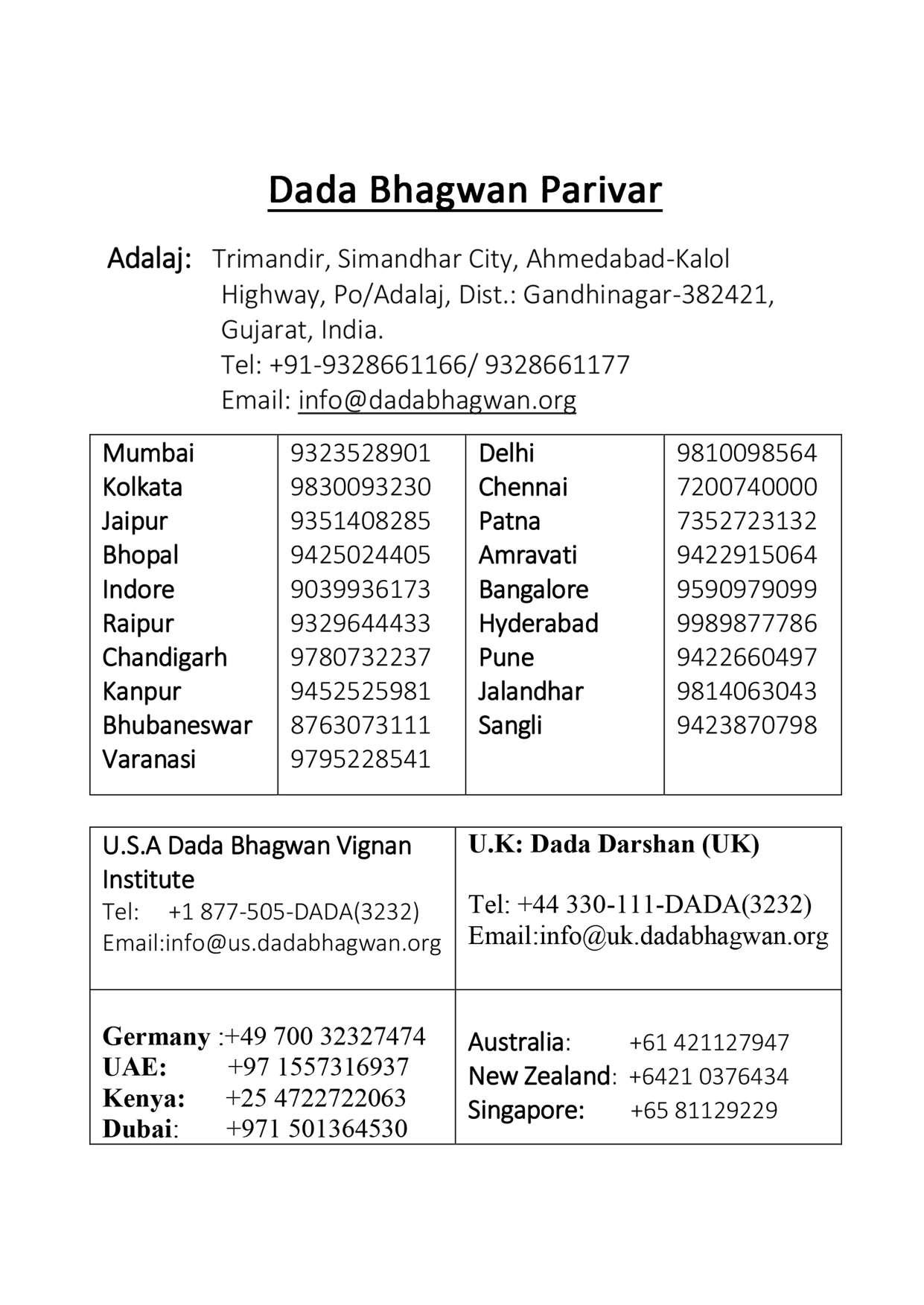 ❖ Dada Bhagwan books are available in different languages: Gujarati, Hindi, English, Marathi, Telugu, Kannada, Oriya, Malayalam, Bengali, Punjabi, Assamese, Tamil, German, Spanish Russian etc. ❖ Few books are available in ‘E’ books in Dada Bhagwan mobile App. ❖ ‘ Dadavani’ Magazine is published every month in three Languages: Gujarati, Hindi, and English www.dadabhagwan.org