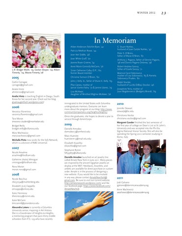 In Memoriam Aileen Anderson Felchlin-Ryan, ‘42 Patricia Meehan Rowe, ‘44 Joan Veit Siddle, ‘48 Joan White Graff, ‘50 Jeanne Royer Greene, ‘54 Anne Marie Connolly McCann, ‘56 L-R: Bridget Walsh, ‘05, Caolan Sleeper, ‘04, Aileen Finnerty, ‘04, Maura Finnerty,’08