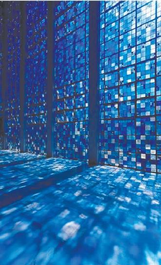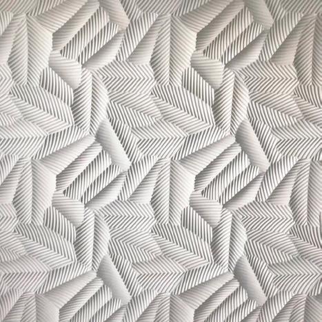 The reception space wall is created out of custom glass tiles I created that follow a geometric pattern of triangles making up a square, 1’ x 1’ tile.