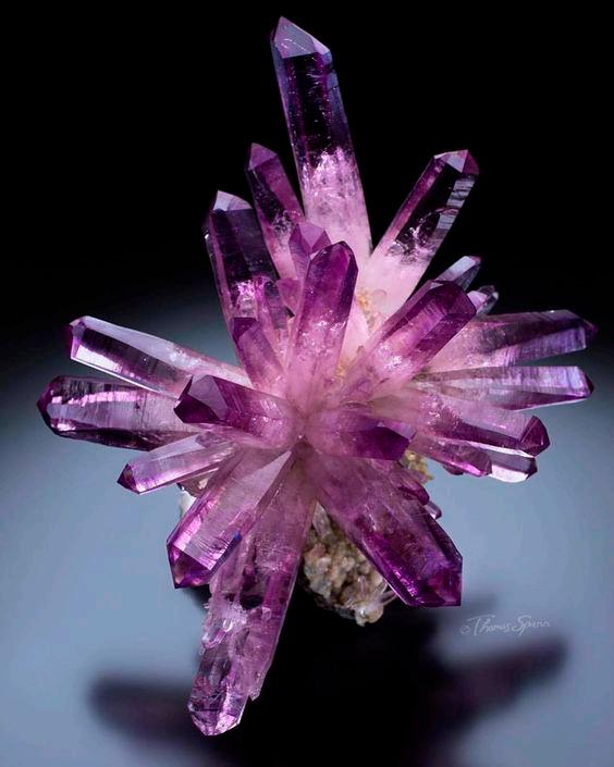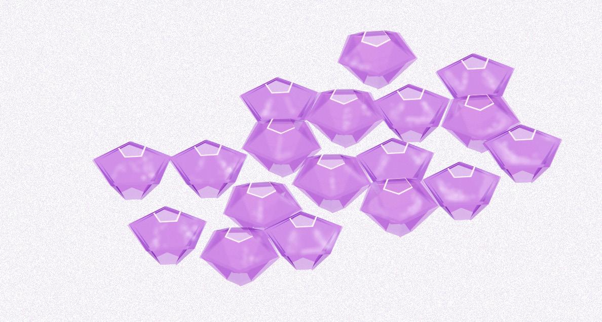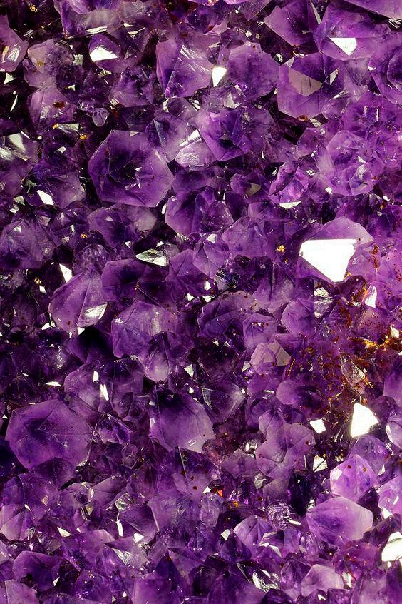 This custom light fixture is made of a purple colored glass and molded to make gem like shapes. These lights are suspended from the ceiling and placed in a way to create order and allow light to come through them.