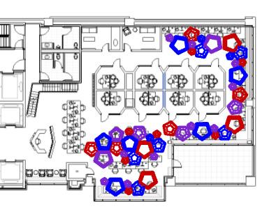 Originally created in Rhino, I went through many different iterations in shapes, sizes, and colors of these lights. After exporting the lighting samples into Revit and learning what worked, I found the best solution to my design problem was to create a single size shape and color to avoid the space becoming to busy.