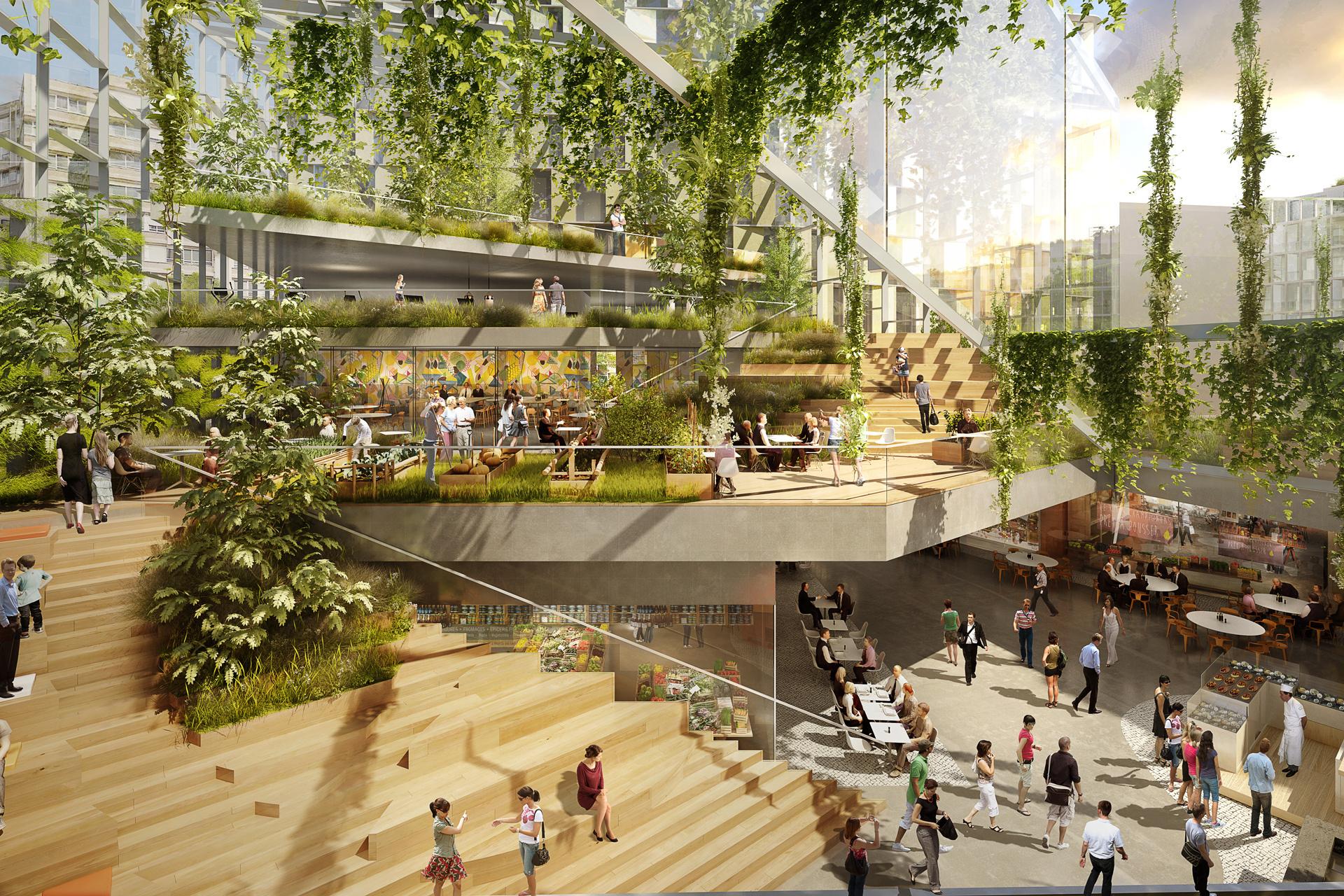 Emplea la simetría para integrar el edificio. Creando no solo visu elementos naturales internos.