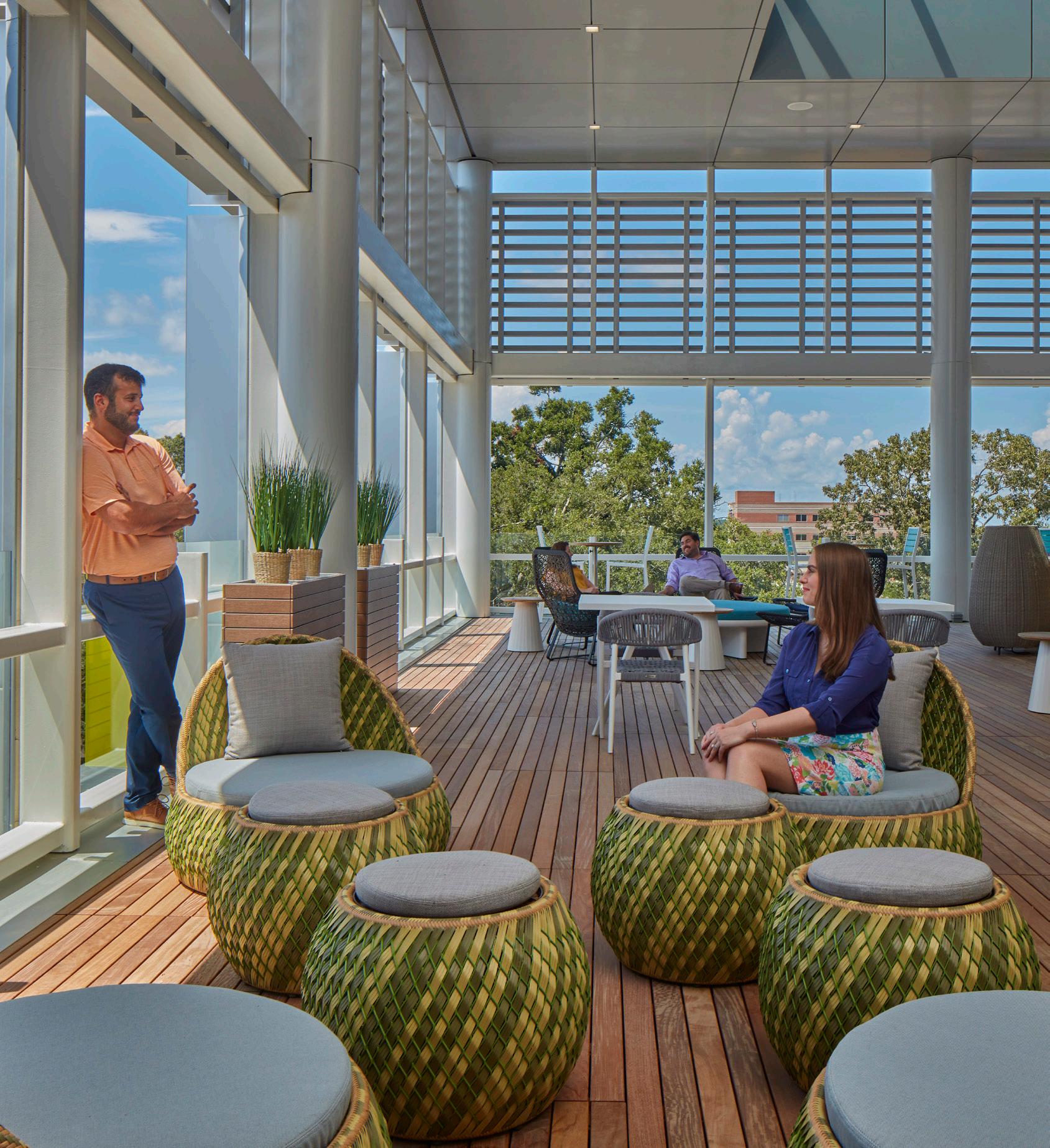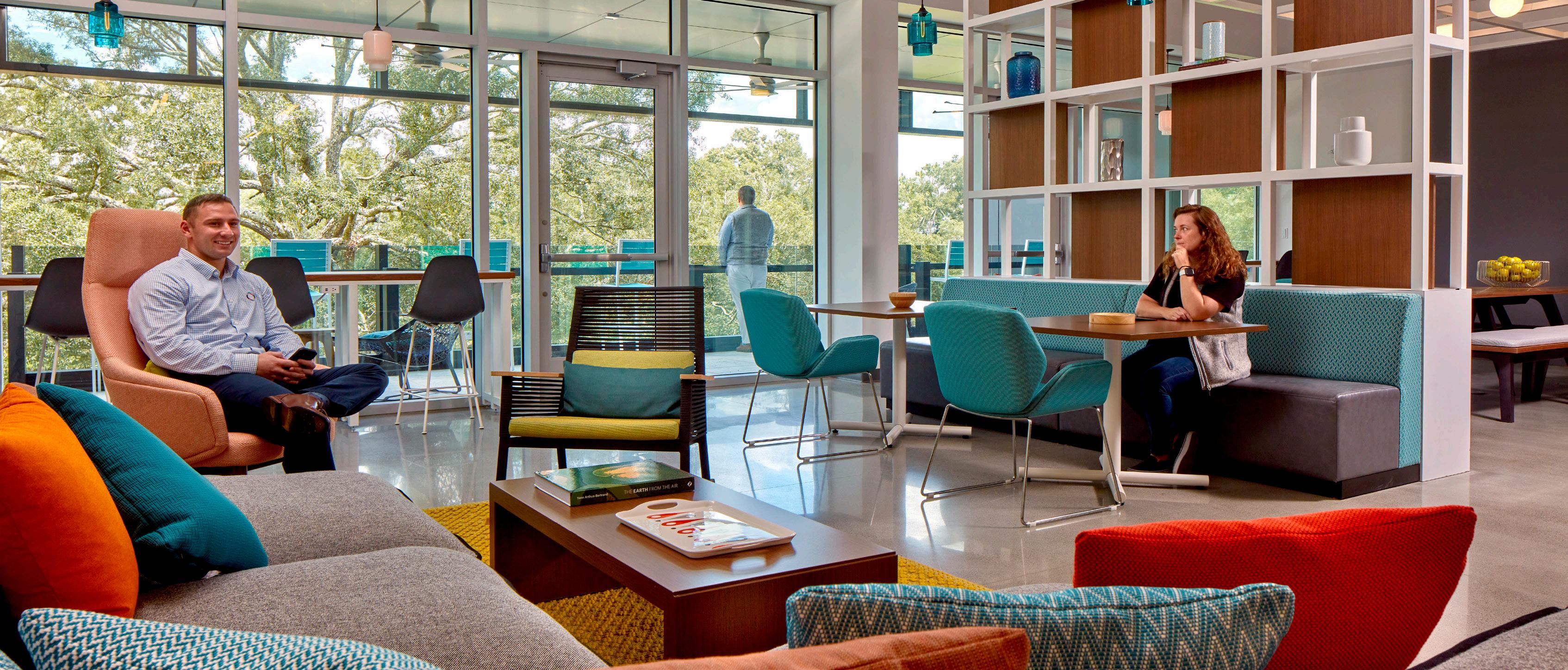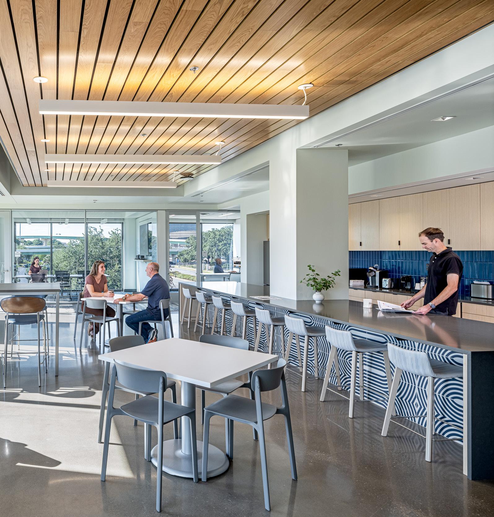 The new headquarters’ design integrates seamlessly with its residential surroundings and provides employees with a flexible, light-filled interior fostering collaboration and individual work styles. Situated on the edge of a residential area, the design minimizes its impact on the neighborhood by orienting the narrow end of the building toward the street and creating a residential-style “Front Yard.” This vibrant green space features Heritage Live Oak trees, including a majestic 500-year-old oak, providing shaded walking paths and areas for outdoor work and recreation. The building’s central feature, a cross-axis circulation area named “Main Street,” fosters informal interactions among employees. The shared break room, known as the “Commons,” incorporates a residential feel with a mix of café tables, living room furniture, and private booths.