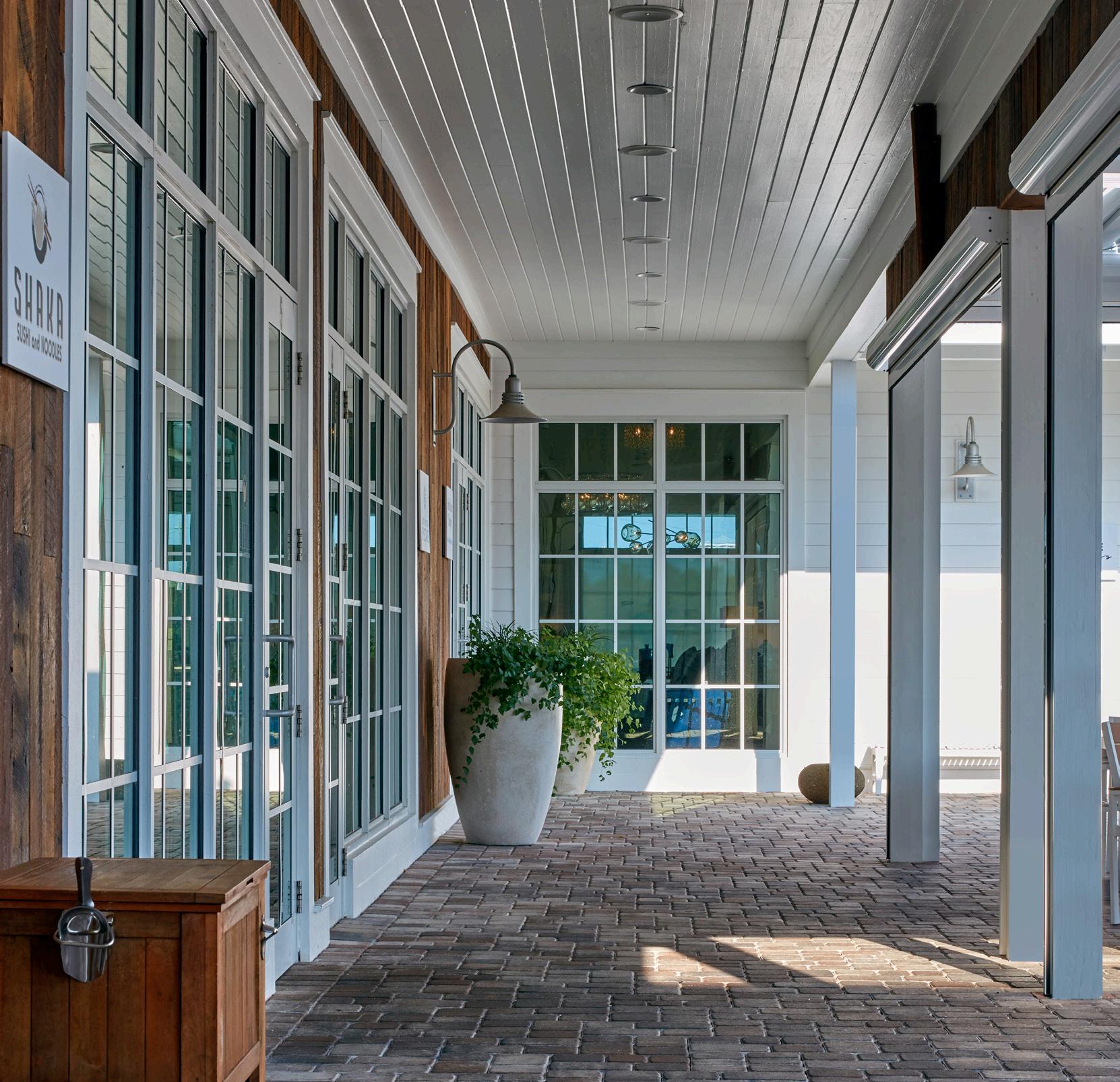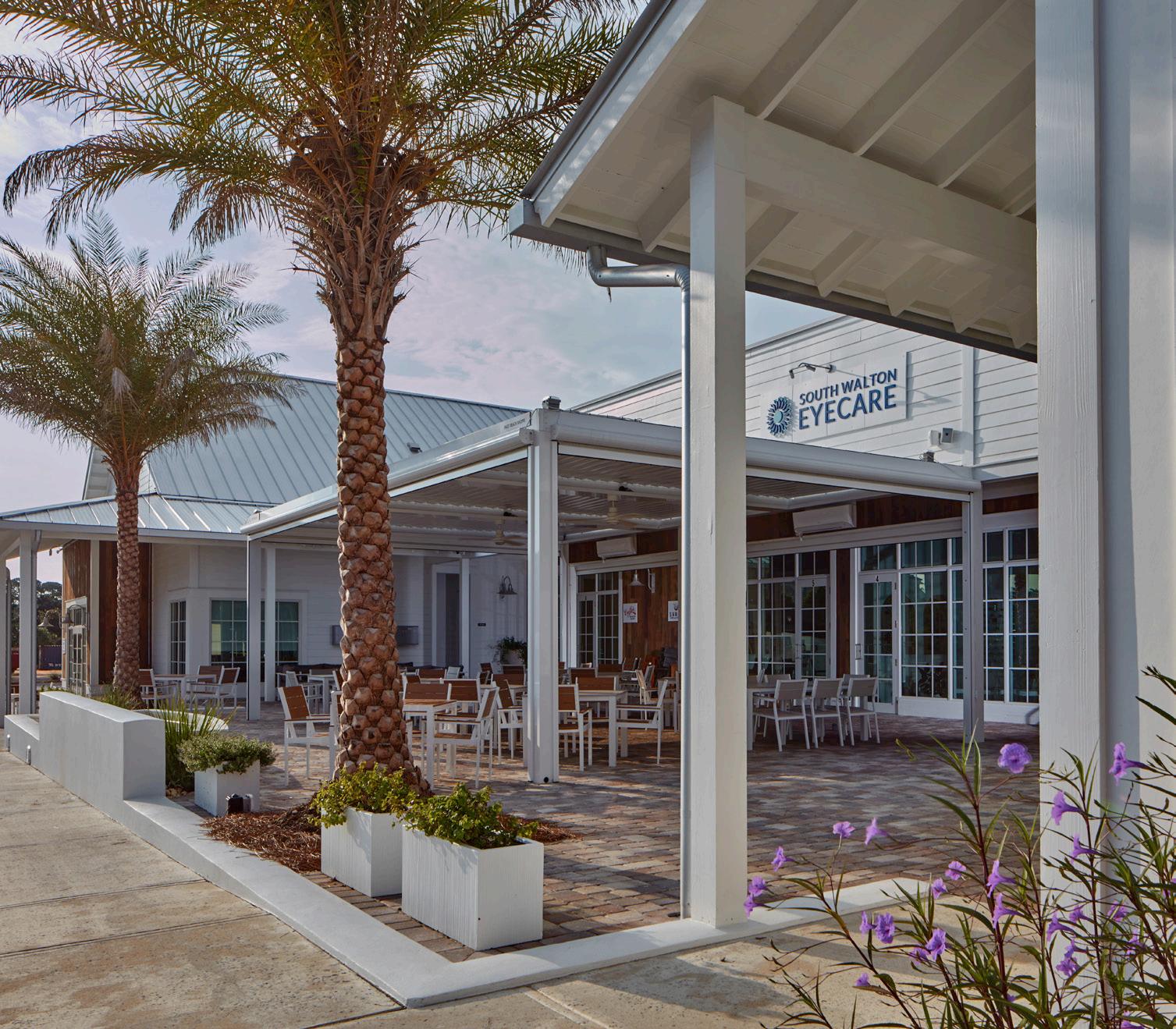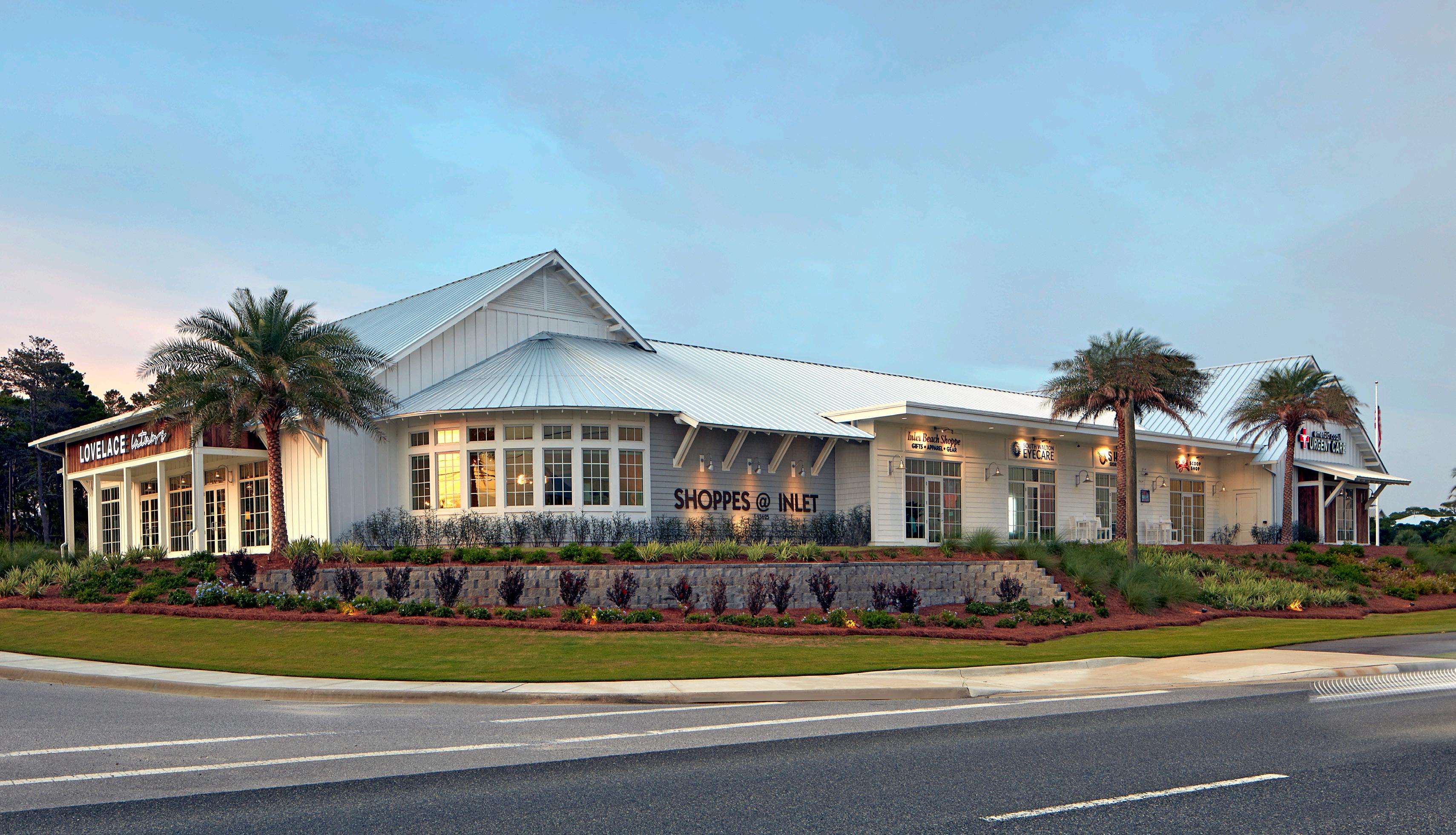 The Shoppes @ Inlet is a 14,000 SF retail and restaurant complex design that enjoys a prime location on East Emerald Coast Parkway (US98). In keeping with the architectural vernacular of the area, the buildings are styled to pay homage to the Historic Florida style, with reclaimed wood accents, white painted lap siding, and a panoramic 120-degree presentation window. The courtyard offers a multi-use outdoor landscape complete with a relaxing water feature and comfortable seating for dining and enjoying music.