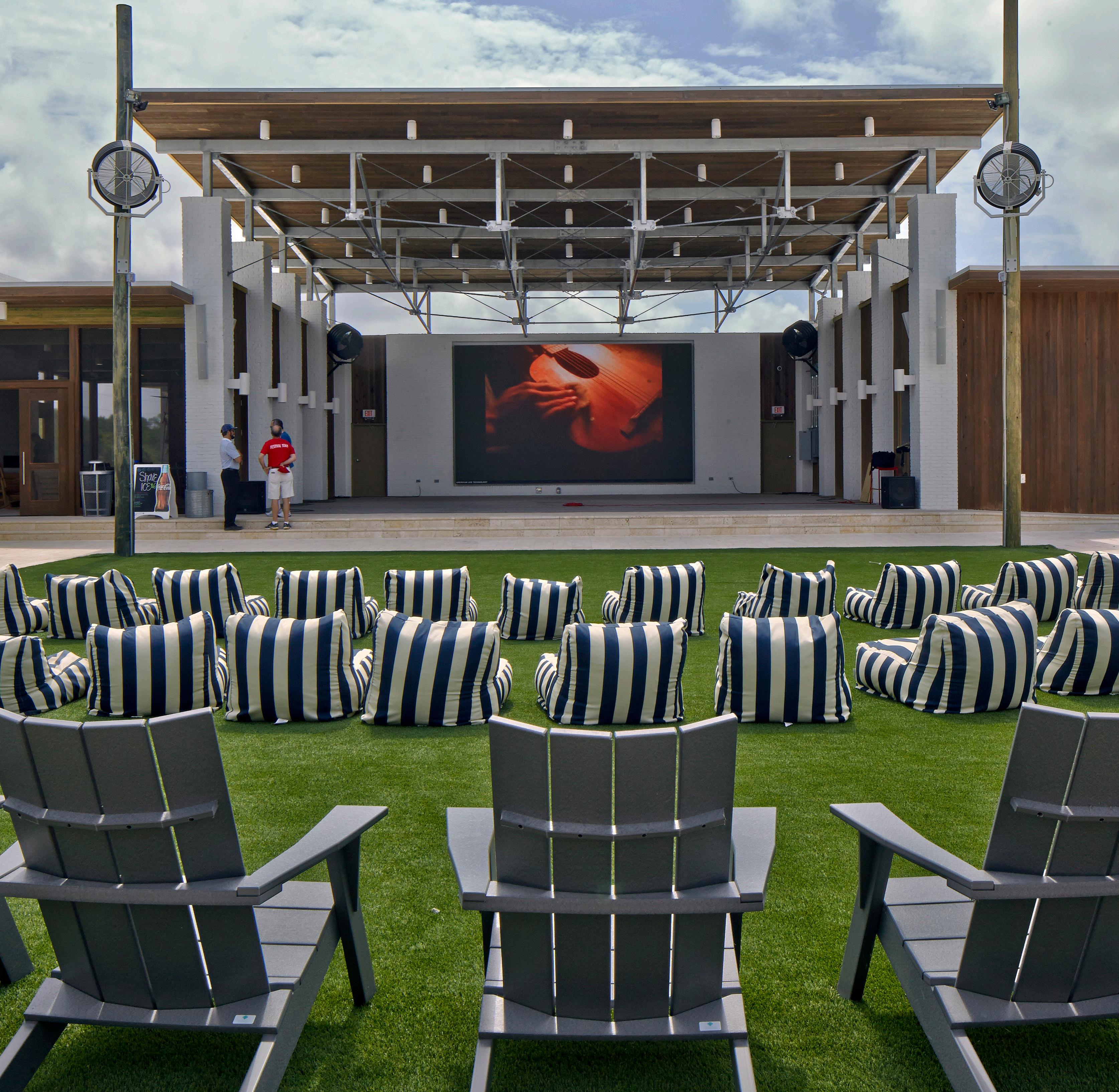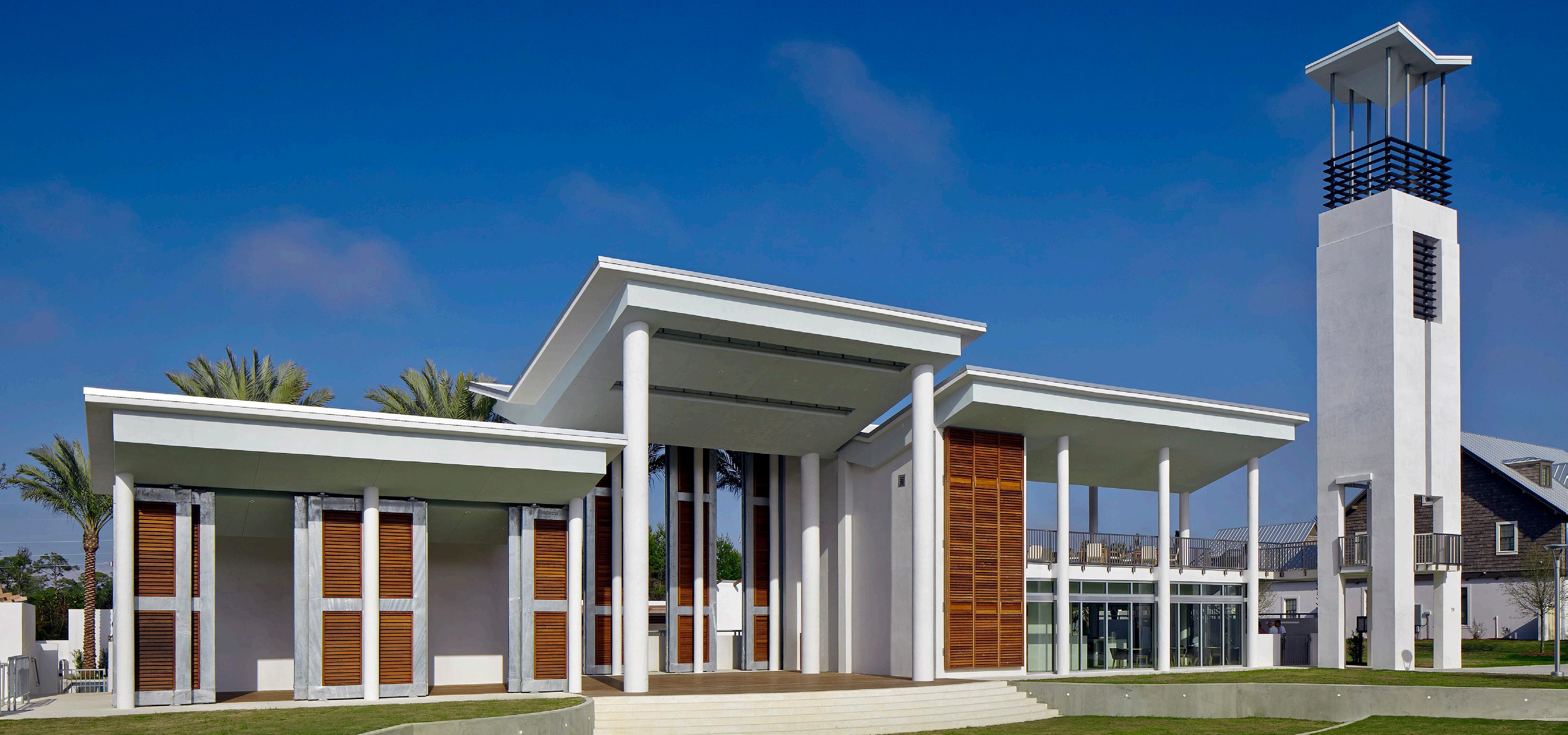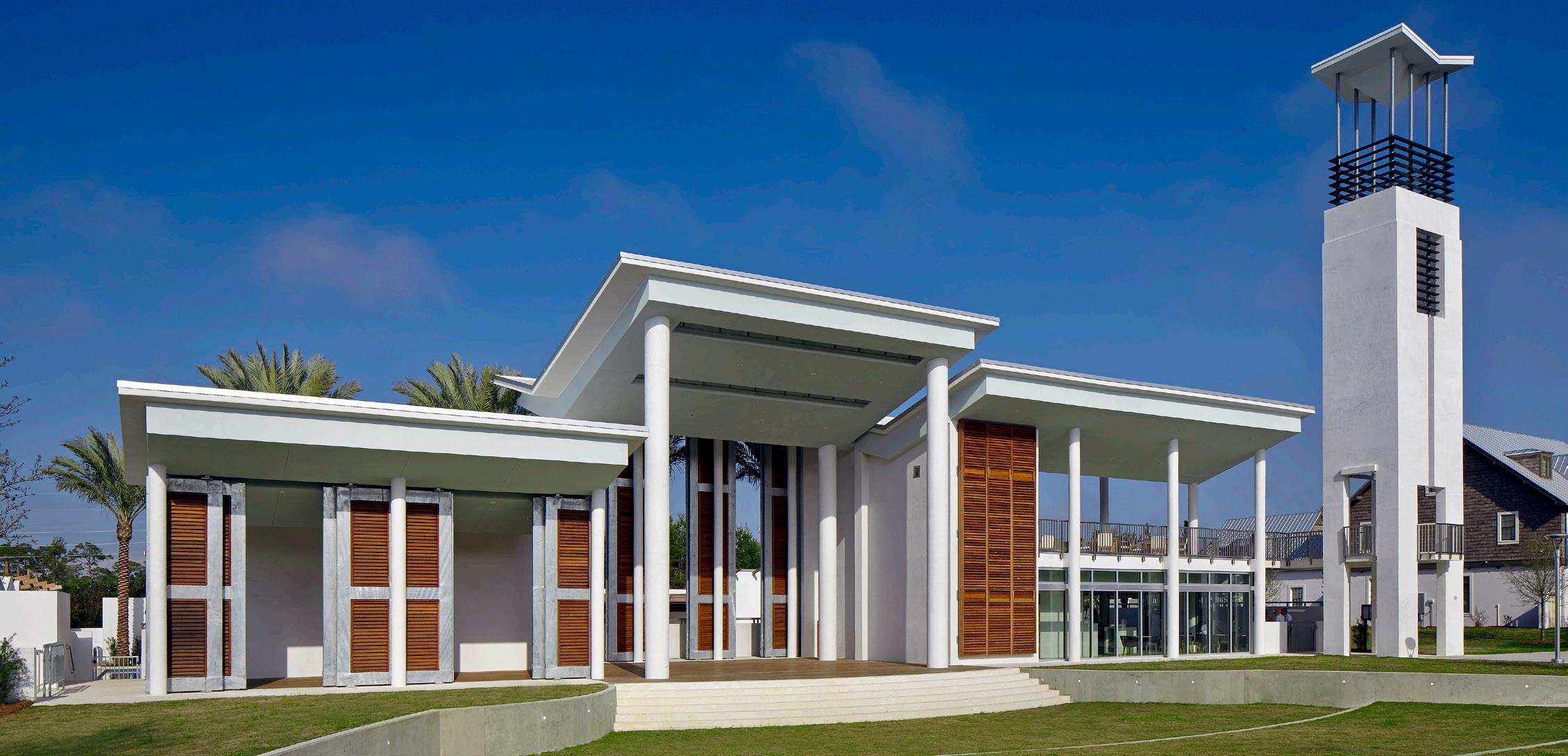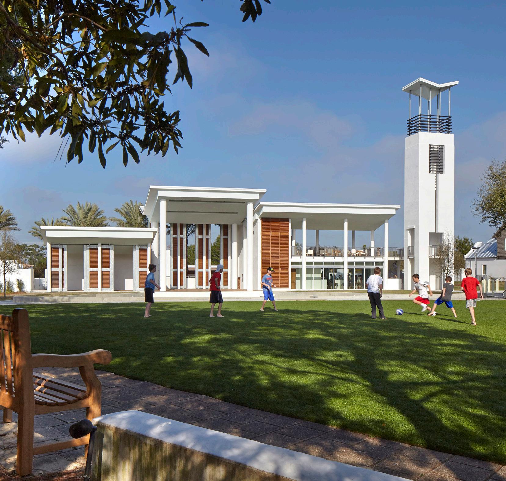 Rosemary Beach is an iconic new urbanist community located on Highway 30A in Walton County, Florida. The facility combines a resortstyle pool with cabanas as well as a cozy clubhouse often used for private events. In addition to a bocce ball court, there is an outdoor performance amphitheater for community use. The covered stage was designed to be partially enclosed to heighten acoustic quality, and the terraced landscape seats approximately 400 spectators. Stepped lawn terraces with concrete pavers are on each side for picnic tables, providing casual seating for smaller events, such as movies, concerts, lectures, and celebrations. The 72-foot tower provides an iconic landmark visible from the main highway and within the resort itself.