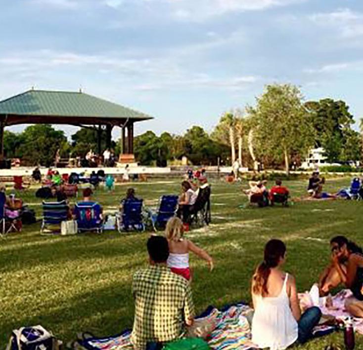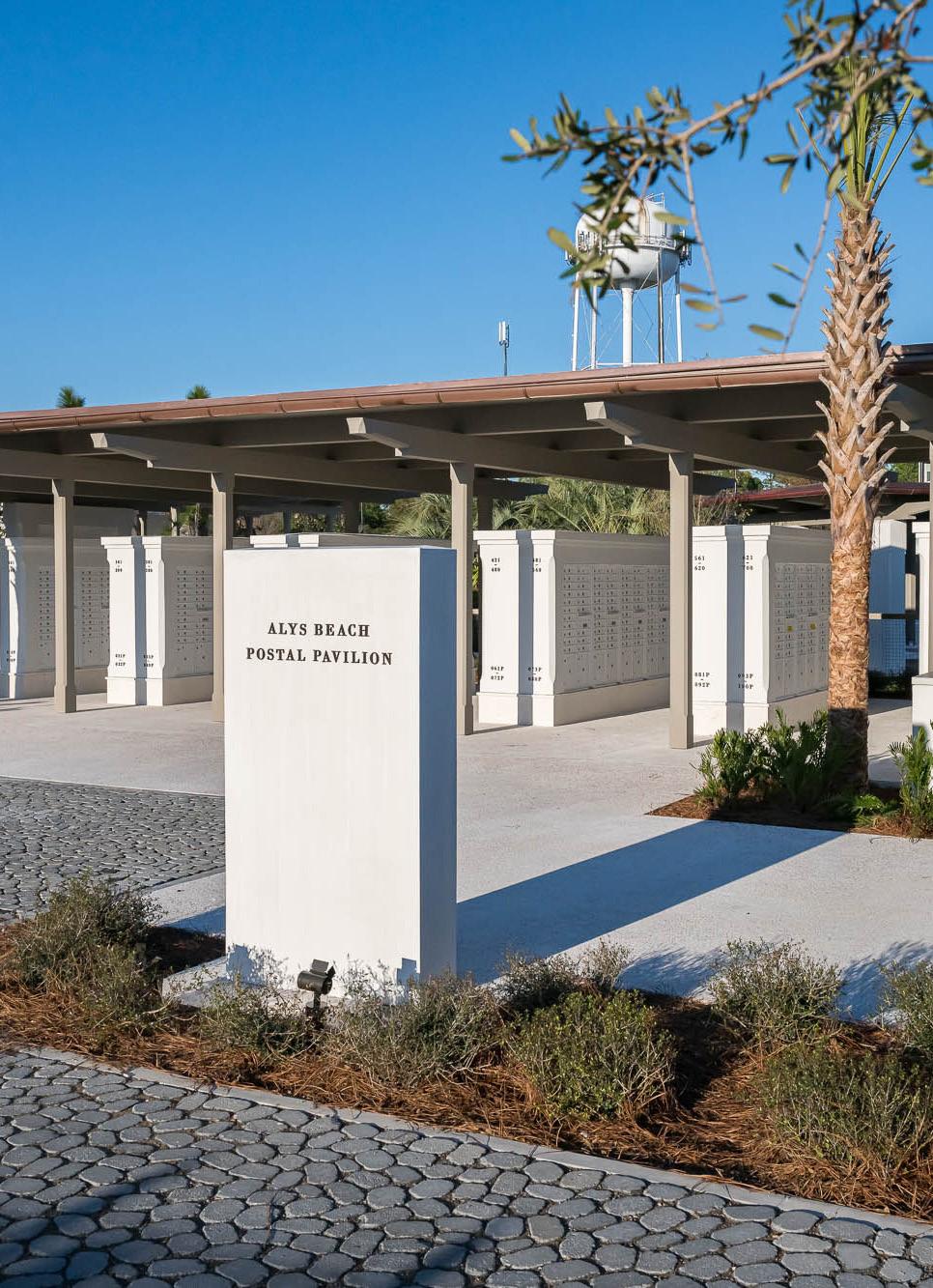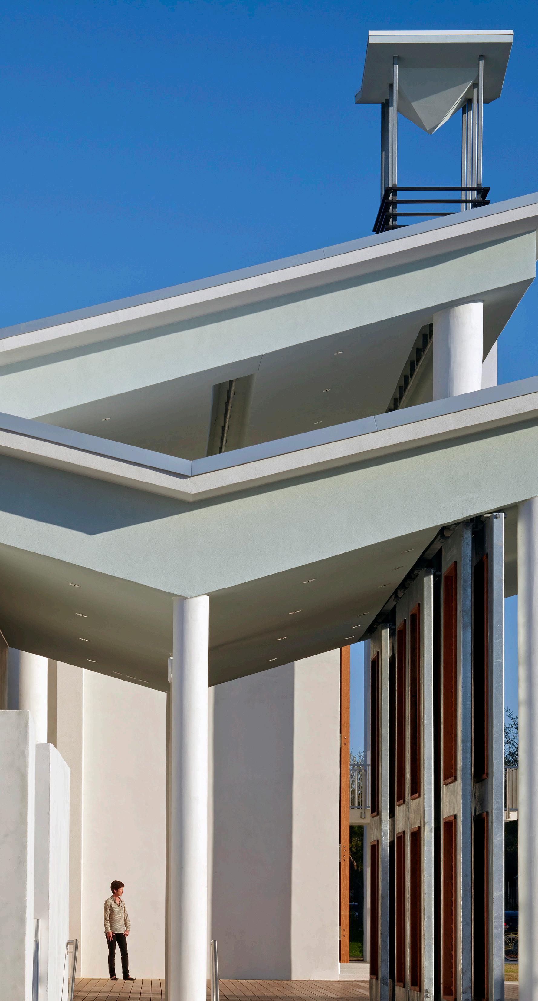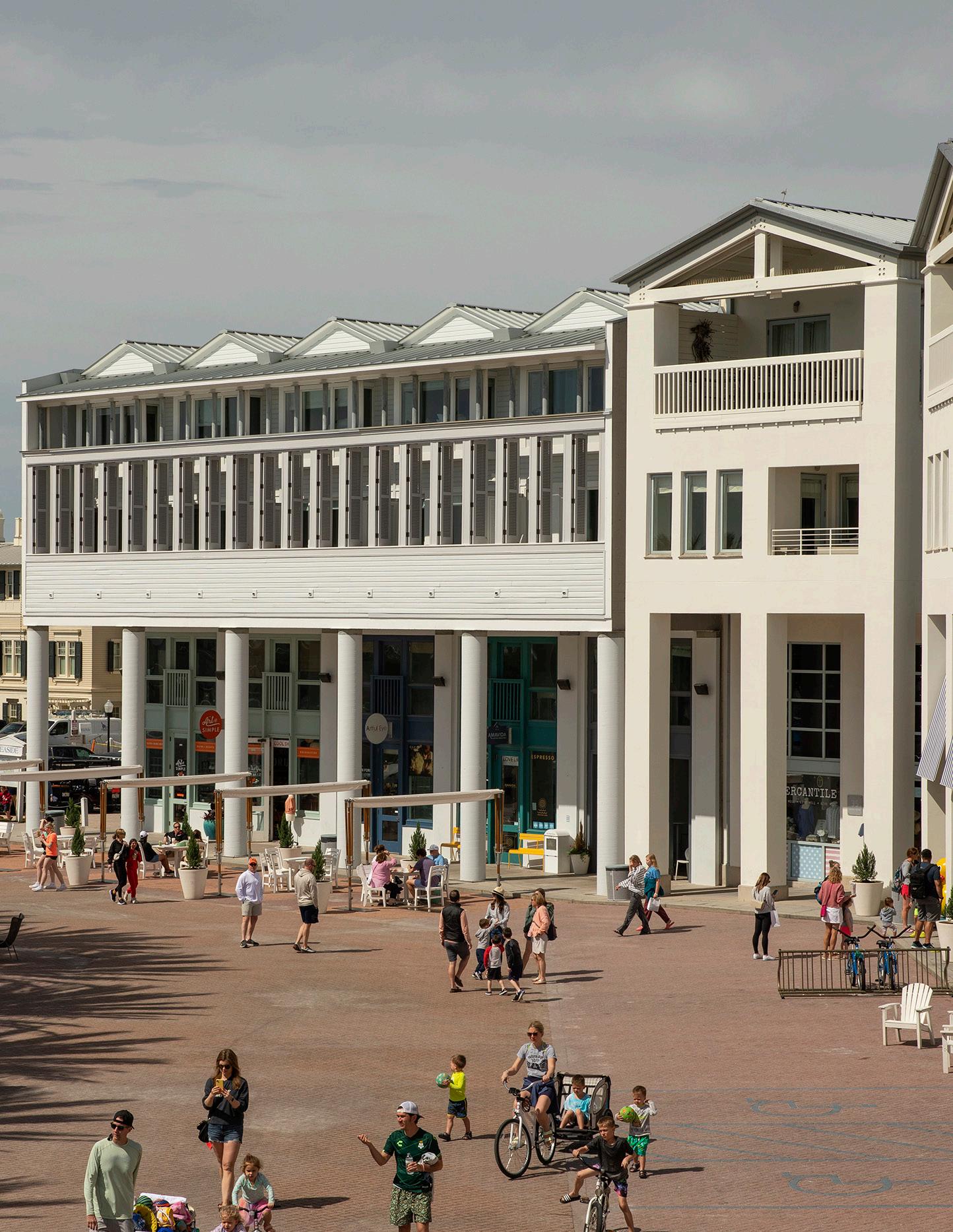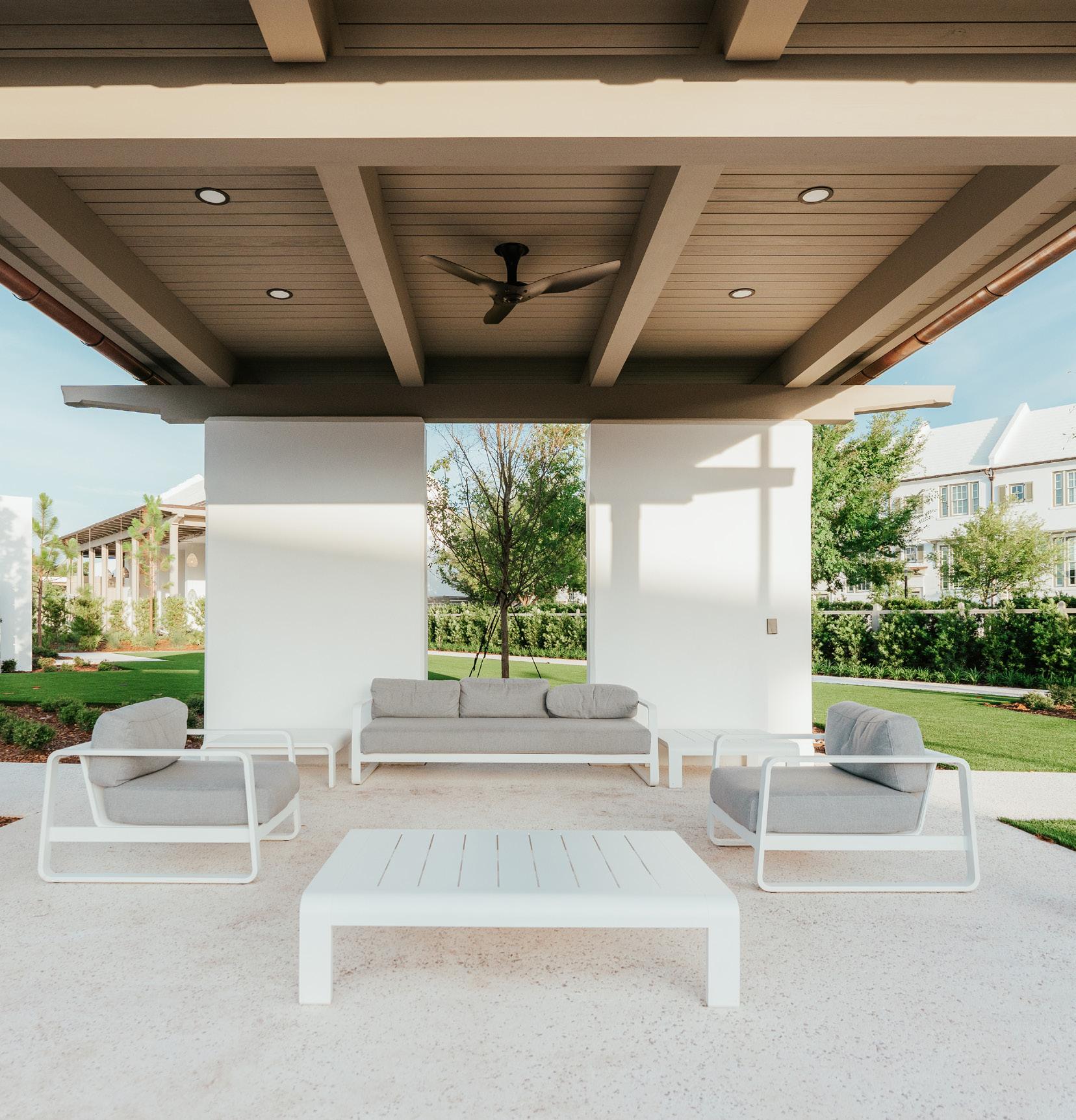 Rosemary Beach is an iconic new urbanist community located on Highway 30A in Walton County, Florida. The facility combines a resortstyle pool with cabanas as well as a cozy clubhouse often used for private events. In addition to a bocce ball court, there is an outdoor performance amphitheater for community use. The covered stage was designed to be partially enclosed to heighten acoustic quality, and the terraced landscape seats approximately 400 spectators. Stepped lawn terraces with concrete pavers are on each side for picnic tables, providing casual seating for smaller events, such as movies, concerts, lectures, and celebrations. The 72-foot tower provides an iconic landmark visible from the main highway and within the resort itself.
