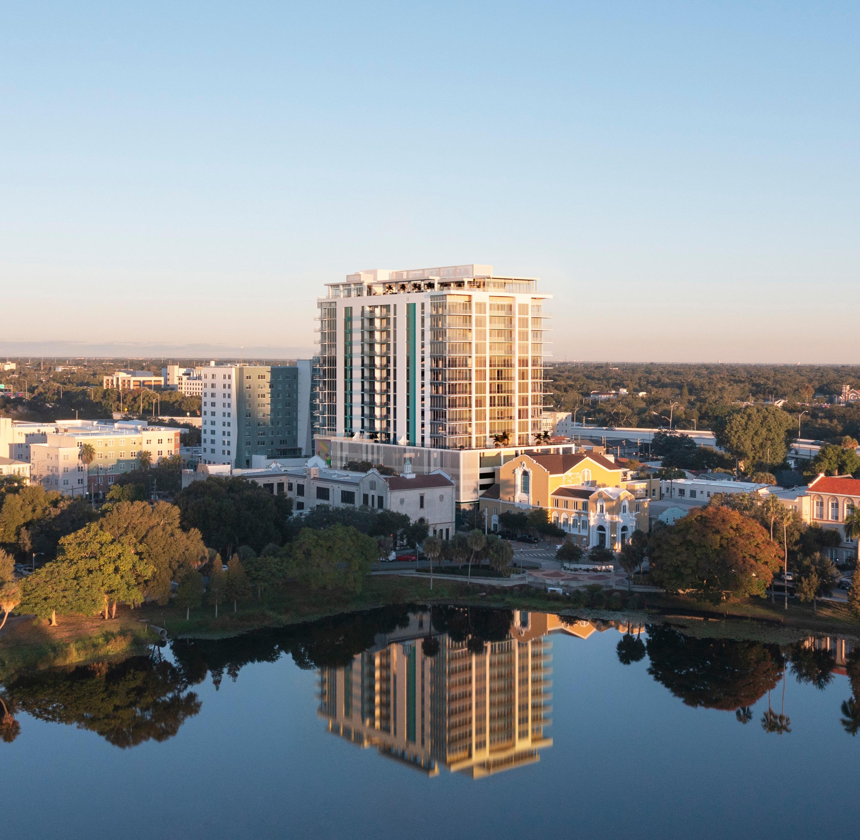 Reflection offers a refined architectural condominium experience set against the backdrop of the serene waters of Mirror Lake in St. Petersburg and its downtown skyline along with the distant shimmer of Tampa Bay. Its artful exterior façade engages with the historic character of the surrounding streetscape, creating a visual dialogue between new and old. At the ground level, landscaped walkways and thoughtfully integrated amenities enhance the lakefront pedestrian experience, while retail spaces activate the street and frame the building’s welcoming two-story lobby.