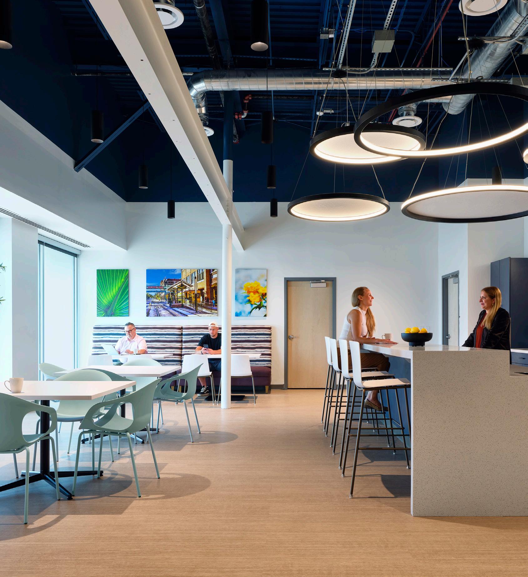 Designed in close collaboration with Interface and staying true to its two-decadeslong commitment to sustainable design, the new world headquarters is a modern, design-forward workplace where employees, customers and partners can learn, work, play and refresh. The building underwent a complete renovation with significant attention to the design of the building systems, focusing on its overall carbon footprint. Designed with a forest motif, the curtain wall of the building has a performance criterion which limits noise and solar penetration into the building providing a healthier environment.