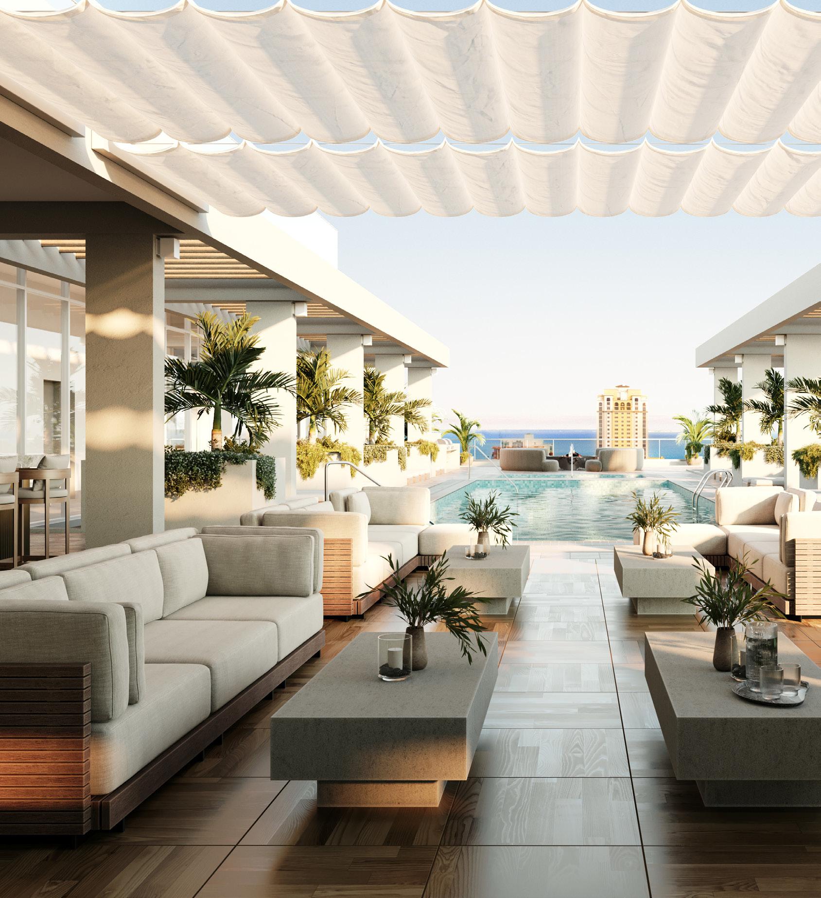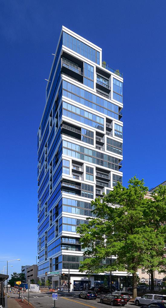The facade has 50% more exterior glass than the typical urban high rise, which gives the units a fresh, airy feel with ample natural light. This modern vertical structure caters to urban professionals and empty nesters with high-end finishes, deluxe amenities, a roof-top pool, and clubhouse with private dining facilities. Balconies are uniquely carved into the building for a striking appearance.