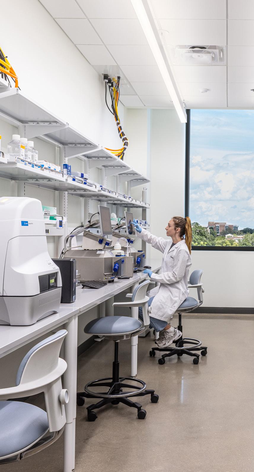 The three-story, 46,000-square-foot facility includes space for administrative support, outreach, and training, in addition to state-ofthe-art laboratories. Program spaces with human activity are oriented to take advantage of north and east natural light. The main entry, with its large protective canopy, extends an invitation to visitors. The third floor provides a south-facing covered terrace beneath the large canopy, giving staff and researchers a sense of choice while enjoying views and breezes to the south. The interior lab spaces are designed for human interactions. Each open lab area is designed to be reworked and reconfigured quickly to accommodate changing tests. Technology built into the facility is designed to be easily upgraded as new testing methods and hardware are developed.