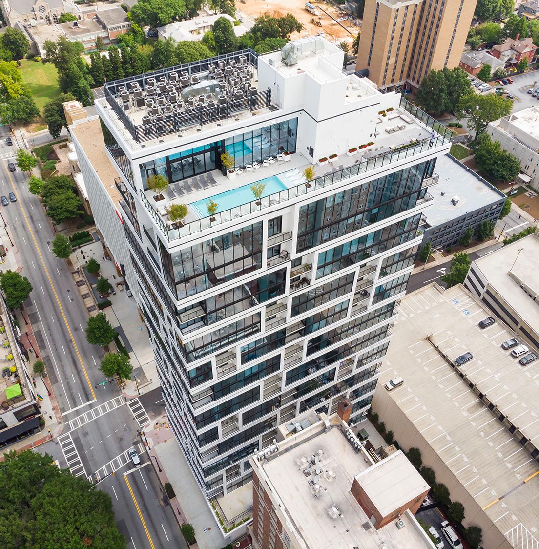 lili is a 24-story luxury residential tower comprised of 197 units, all with a footprint larger than the average high-rise residential development in Atlanta. lili Midtown is sited on less than a third of an acre on the south side of Midtown Atlanta, across from the landmark Fox Theatre. Utilization of an adjacent Hotel Indigo parking deck was key to the project being approved, with a bridge connecting the deck to the urban infill building. Street-level spaces for retail and restaurants were carefully designed in concert with a strict Midtown Alliance requirement for pedestrian-friendly venues.