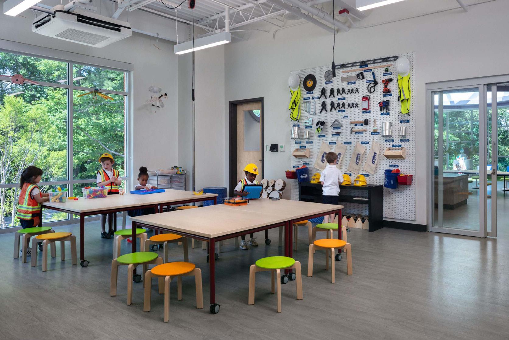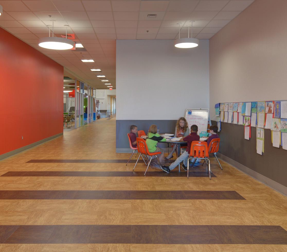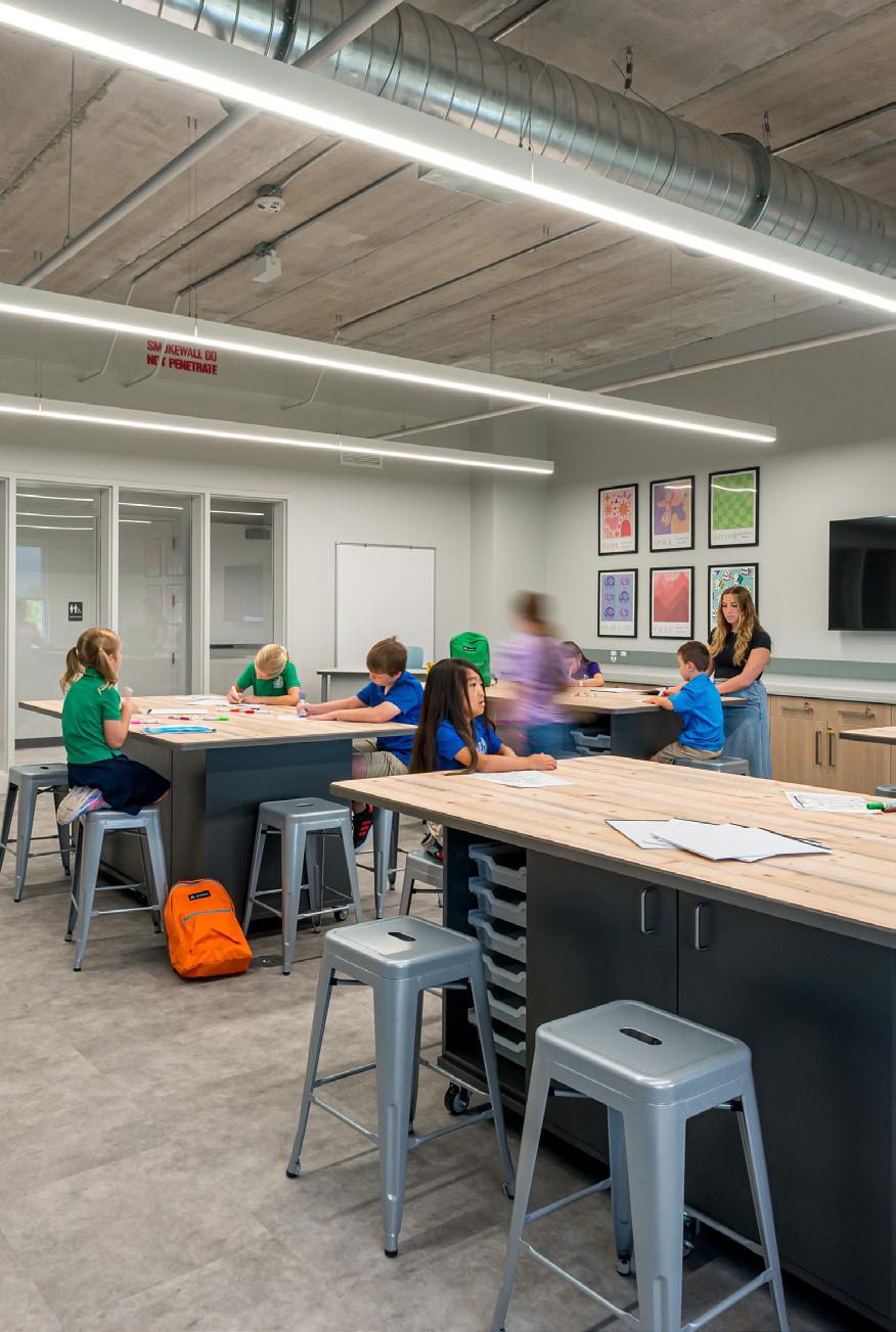 Inside, the design reduced the building’s scale and celebrated its aviation heritage. The secure entry leads to a striking two-story staircase and a central area featuring a vertical wood wing sculpture and gathering space. The central concourse was reconfigured as the main corridor, with former ticketing and lounge spaces becoming a brightly colored, transparent dining and multipurpose area. Baggage claim areas were converted into large gathering zones. Flexible classrooms feature movable walls, corkpatterned luxury vinyl flooring, and acoustic elements.