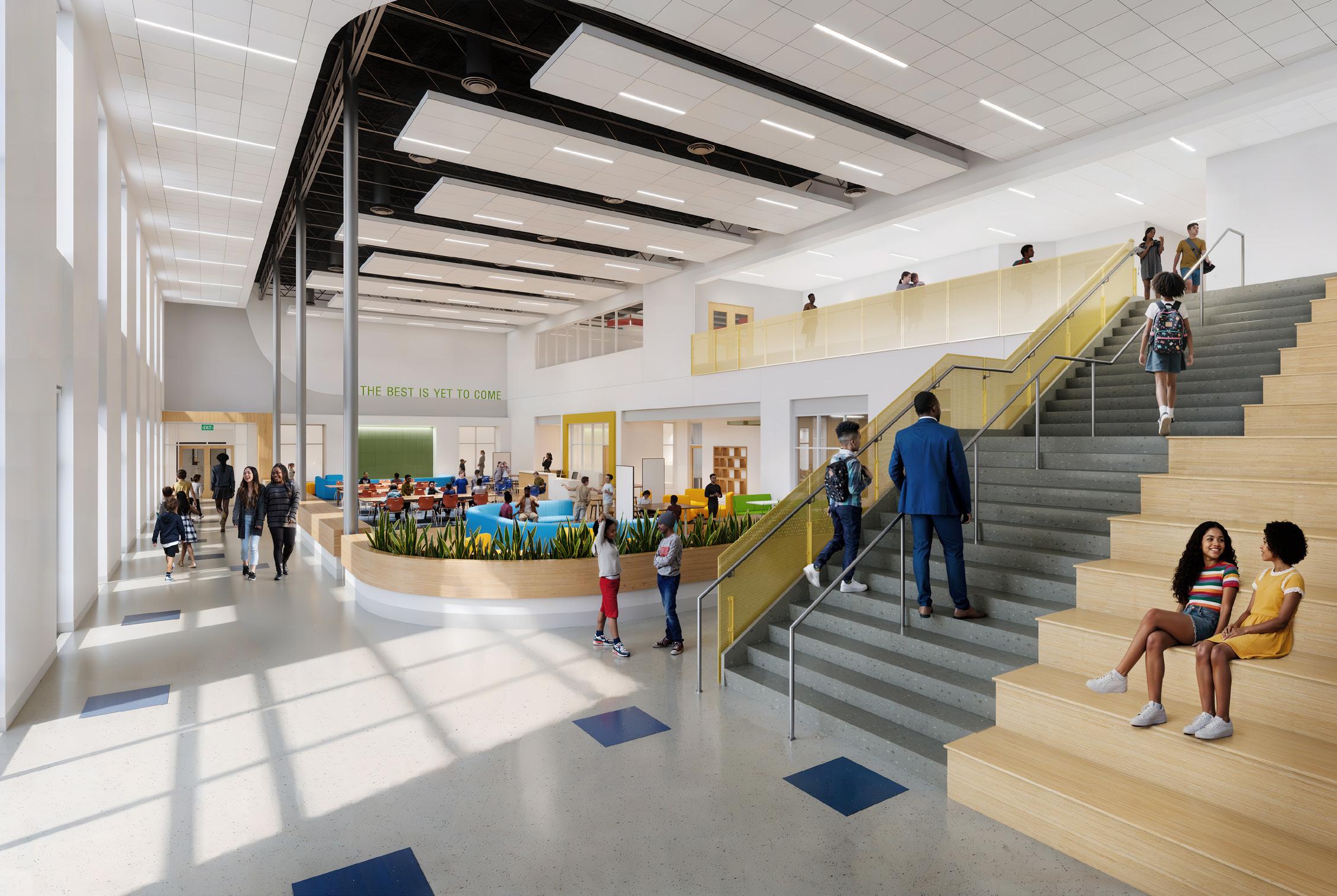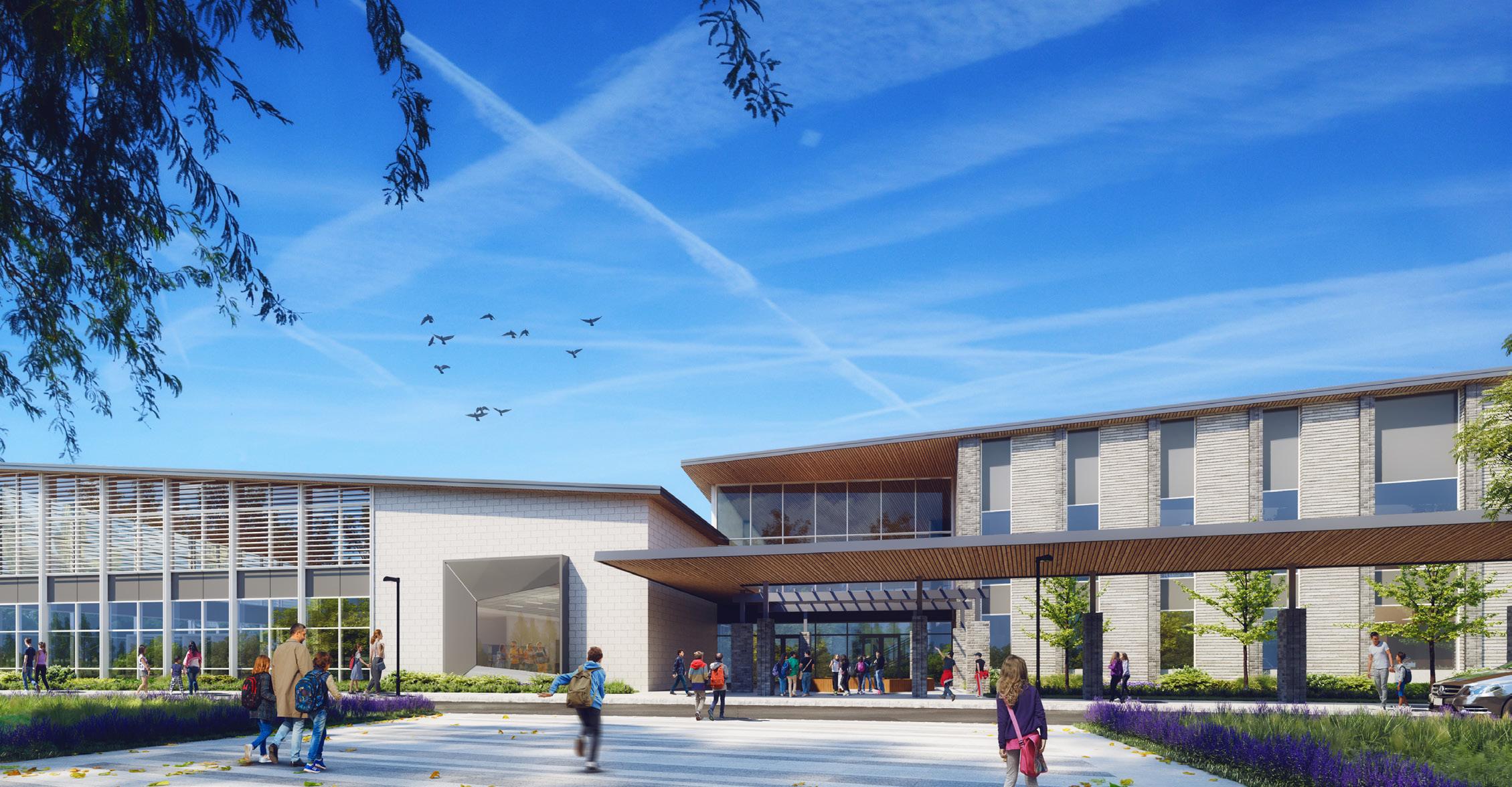The design is guided by the concept of intersecting connections, fostering community, safety, and creative thinking. This approach highlights the interplay between community building and the neural connections formed through learning. A warm, natural color palette with bright accents will be used to enhance positivity and focus, while easing student anxiety. Architectural forms serve as wayfinding elements, creating fluid learning nodes. Zoning and circulation unite elementary and middle school experiences, encouraging community and maintaining safety through clear sightlines.