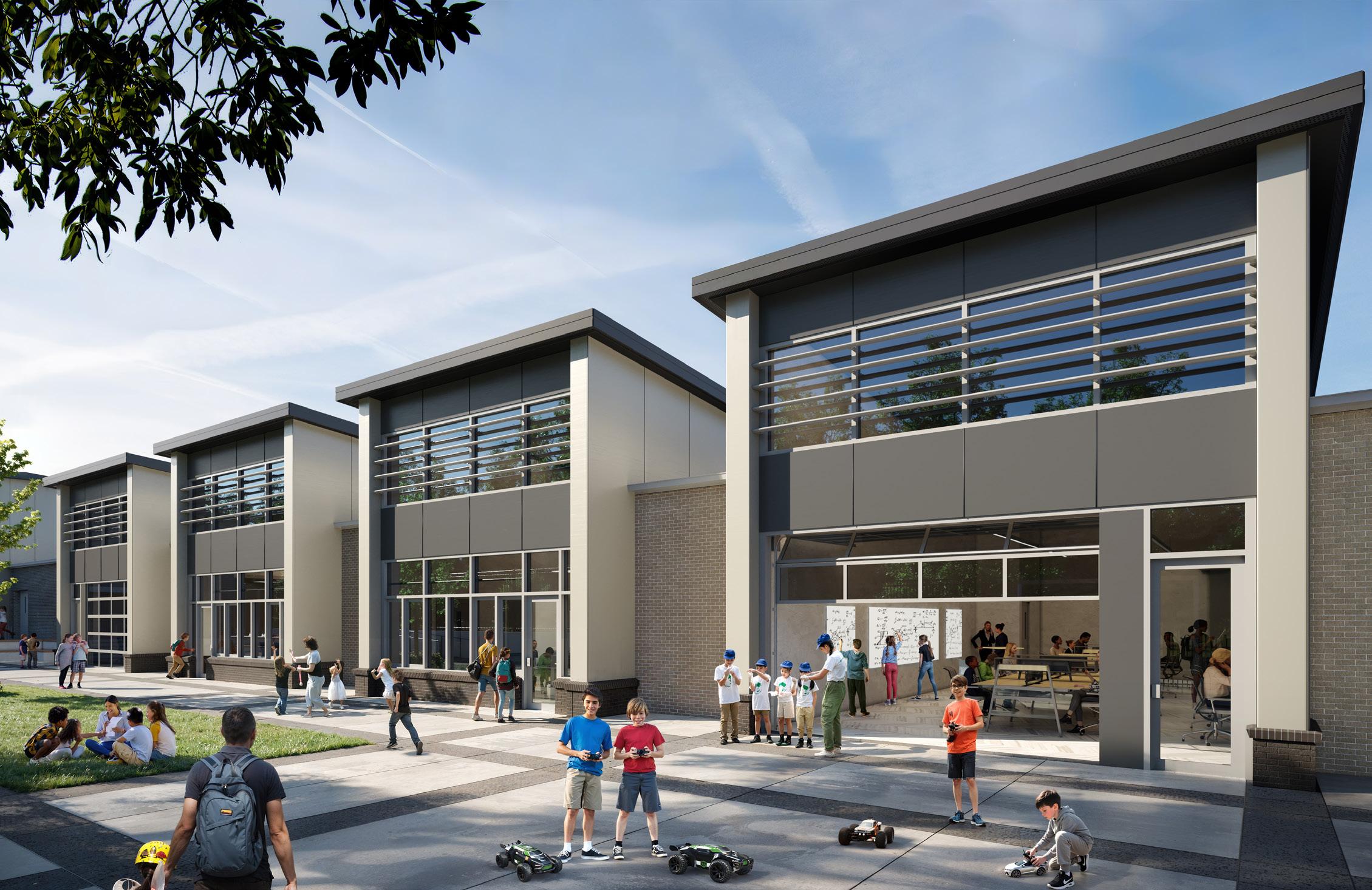 The master plan evolved during the design process to better serve the educational program. When the original concept of housing band and chorus rooms within the high school addition proved problematic due to acoustic concerns, the team reimagined a former utility yard as a dedicated arts building. Through extensive massing studies evaluating various schemes for a new K-8 Expansion, the design team ultimately determined that a three-story solution would best serve the program requirements.