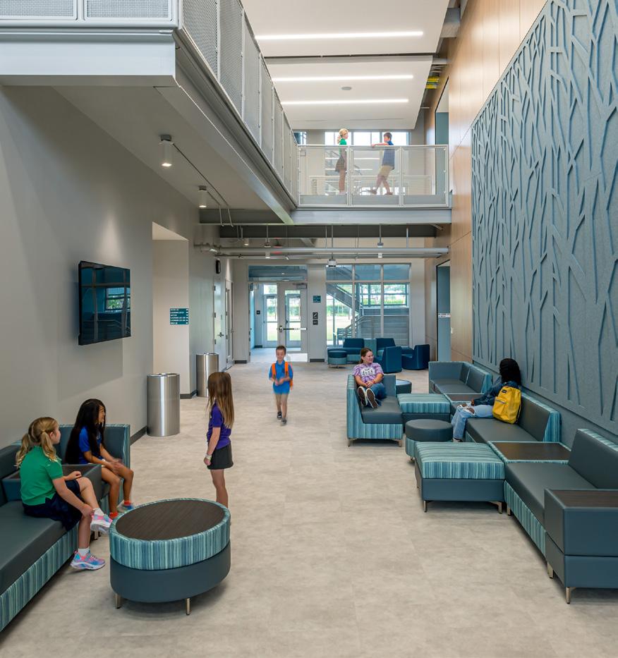 The building’s signature moment occurs immediately upon arrival. Visitors pass through a secure lobby leading to a dramatic two-story atrium. Dubbed “the Connector,” the bridge-like balcony spans the space, allowing students to engage with the activity below. This central gathering space features ultra-wide corridors that extend learning beyond classroom walls, with dedicated learning nodes positioned every four classrooms. Huddle rooms off the main corridors provide quiet spaces for small groups to work.