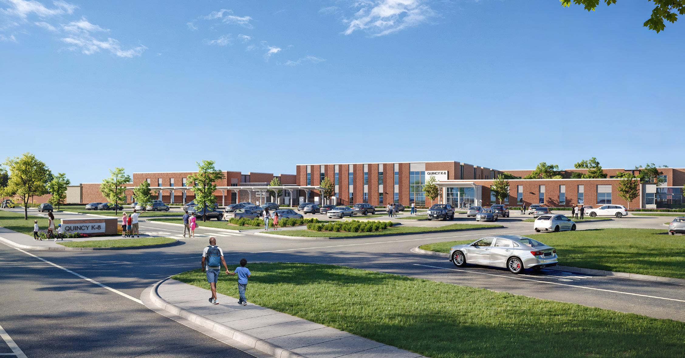 The L-shaped floor plan connects the new construction to the existing high school at the rear. We relocated the administrative suite to the new expansion which serves as a new front door for the K-8 school. The modern addition completes the next phase of the campus vision and promotes the continued growth of the campus as a leader in education in the community.