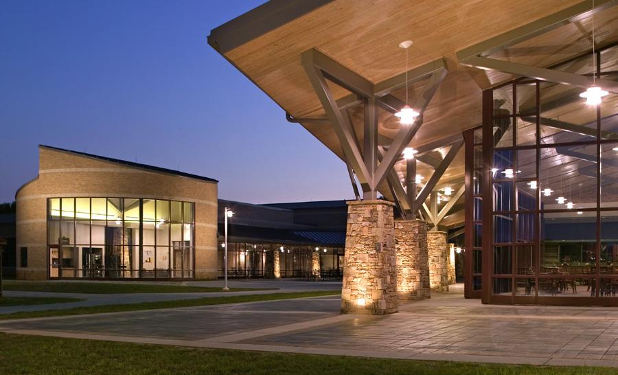 The 42,000 SF multi-discipline building includes classrooms, computer labs, industrial labs, meeting rooms, and a kitchen to support the school’s secondary education programs. With a primary mission of workforce development, the building provides for programs in culinary arts, industrial systems technology, accounting, emergency medical technology, and finance. The compact satellite campus is organized on a rolling hillside around an indoor-outdoor common area. This centrally located meeting space maximizes interaction of students and faculty. *Designed by Larry Sweat while at another firm.