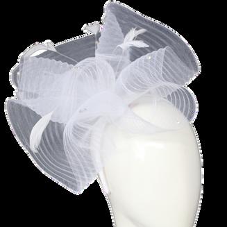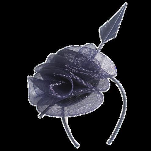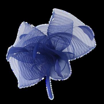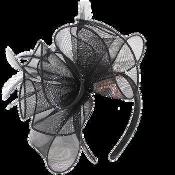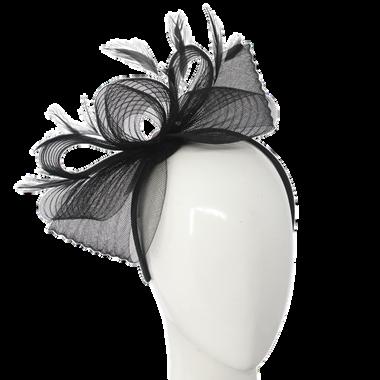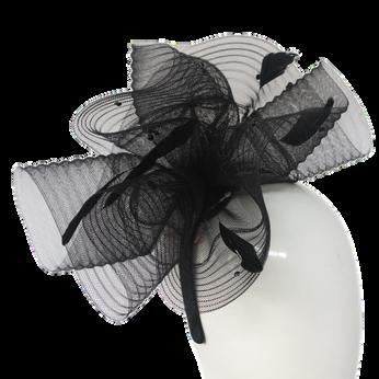 Large gathered crinolin swirl with feathers on headband Colours: Black, Blush, Royal Blue, White.