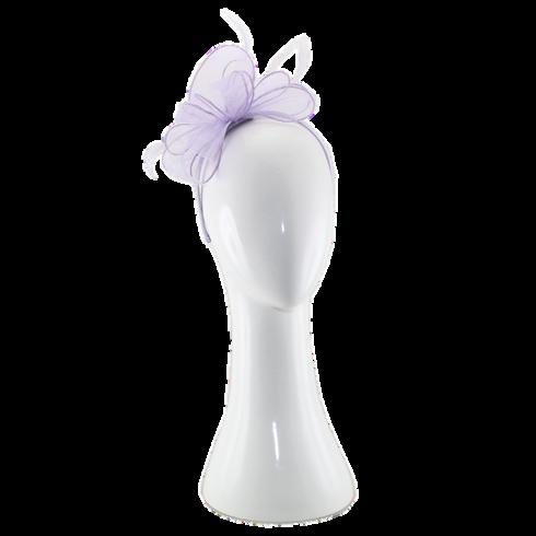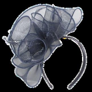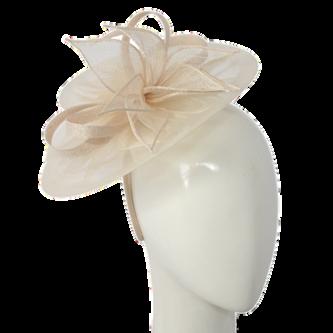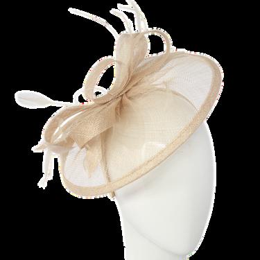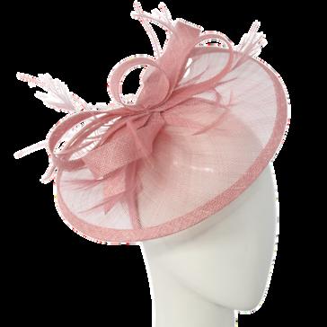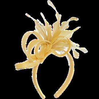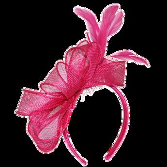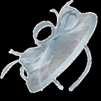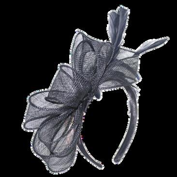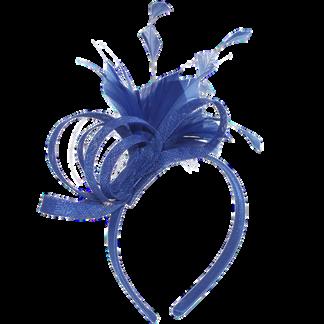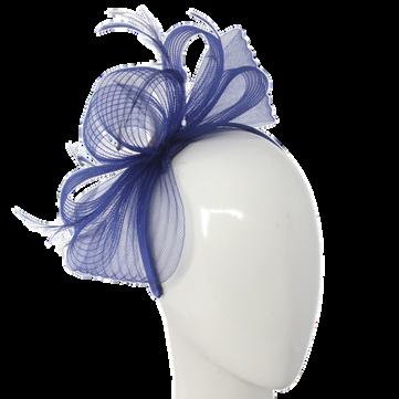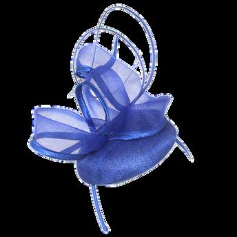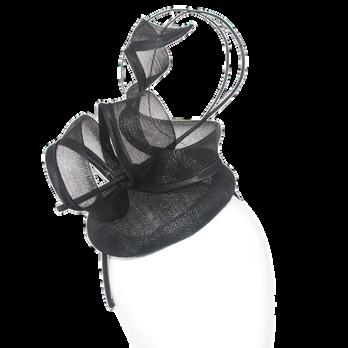 Sinamay disk with loops and quill on headband. Colours: Black, Blue, Champagne, Pink.