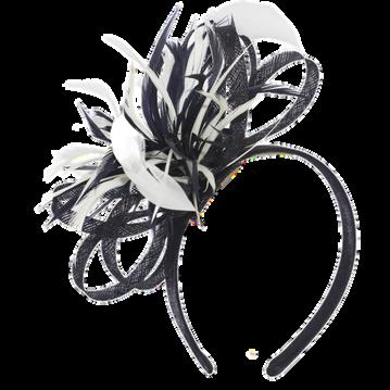 Sinamay loops with 2 tone feathers on head Colours: Black/White, Navy/White, Red/Black.